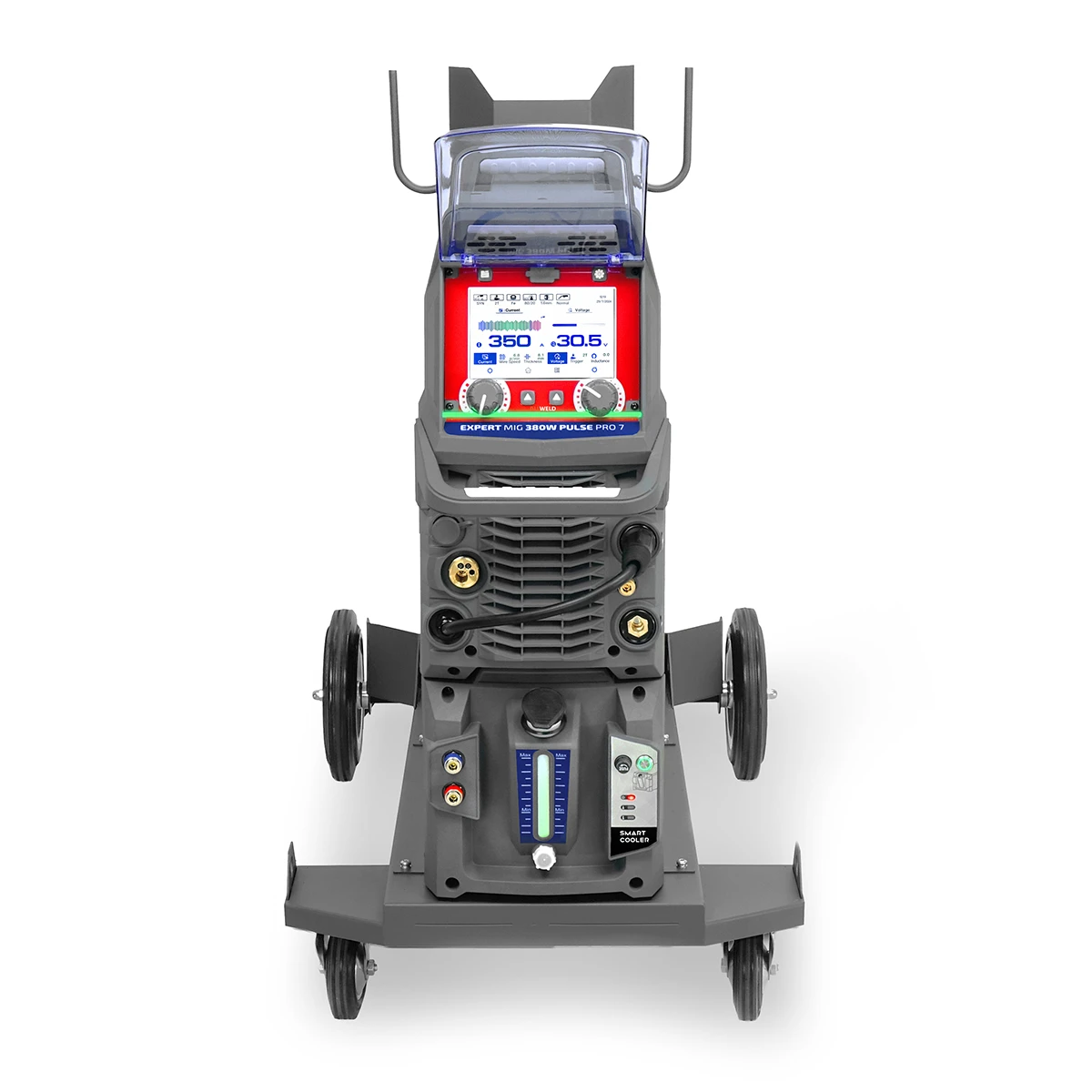 EXPERT MIG 380W PULSE Pro7 LCD to zaawansowane źródło spawalnicze przeznaczone do profesjonalnych zastosowań przemysłowych. Umożliwia spawanie MIG/MAG w trybach manualnym, synergicznym, PULS i DUAL PULS, a także metody TIG DC i MMA. Wyposażony został w dotykowy ekran 7" LCD, 4-rolkowy podajnik, chłodnicę wodną i uchwyt MB501W z ekranem sterowania. Zasilany jest 3-fazowo 400 V i dyspouje maksymalnym prądem spawania 350 A przy cyklu pracy 60%.