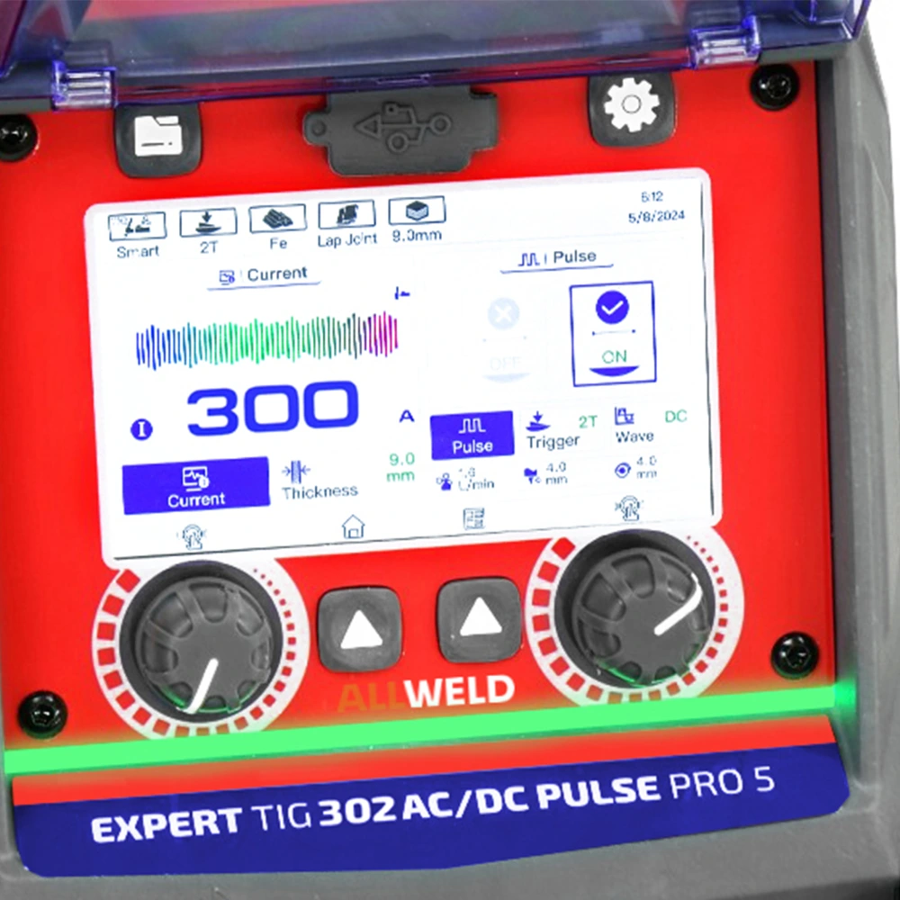 5-calowy dotykowy ekran LCD pozwala łatwo regulować parametry, takie jak puls (0,5–999 Hz), częstotliwość AC (50–250 Hz), kształty fali oraz SMART TIG (ustawienia synergiczne). Funkcja CAP SHAPING umożliwiająca uzyskanie idealnie zaokrąglonej końcówki elektrody, a ARC FORCE, HOT START ułatwiają spawanie MMA.