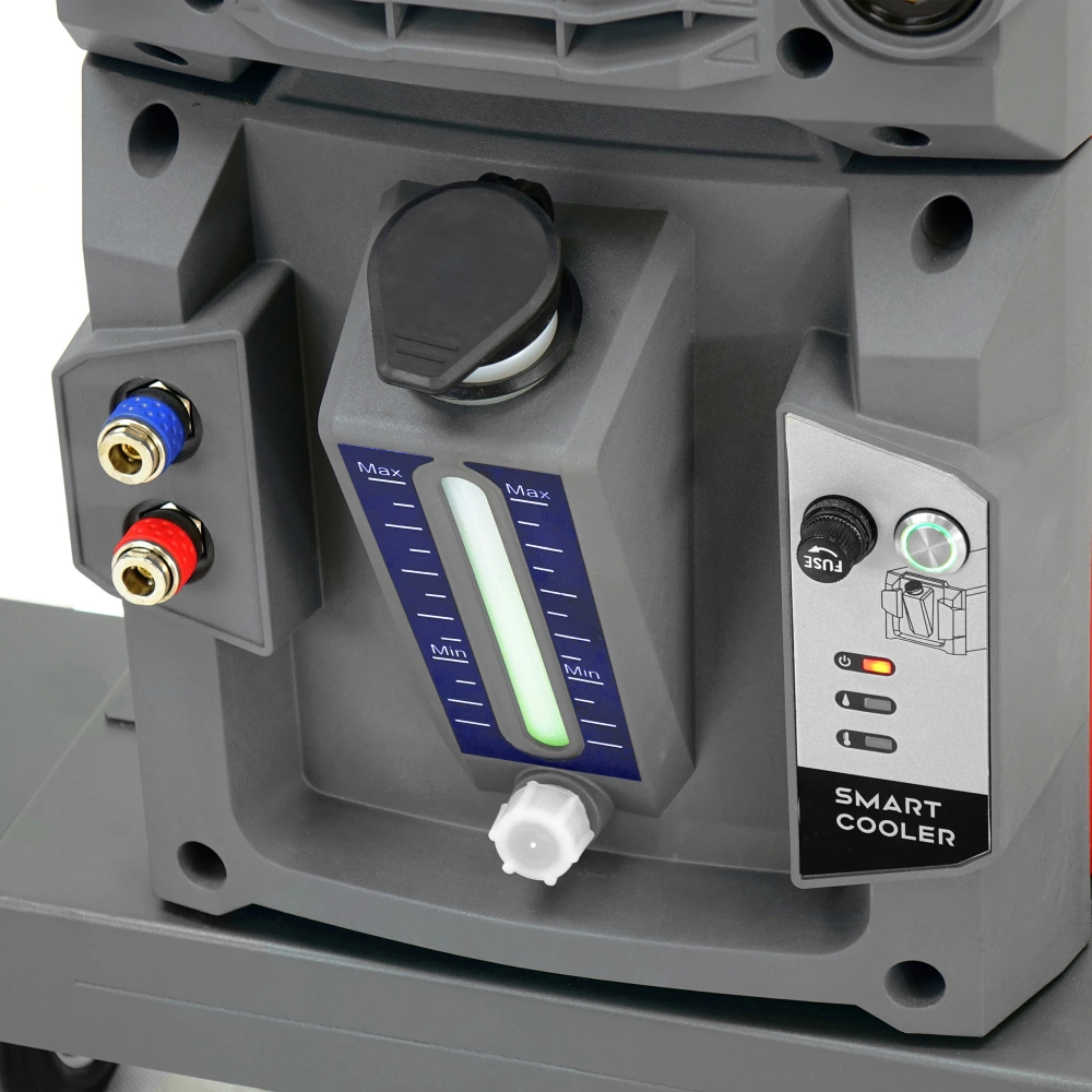 TIG AC/DC Pro7 LCD oferuje dwa system chłodzenia (AF-Wentylaror/WC-Ciecz z 5-litrowym zbiornikiem). Tryb (Water Cooler) - układ chłodzenia cieczą zapewnia efektywne chłodzenie uchwytu podczas intensywnego spawania przy wyższych zakresach prądowych, wydłużając żywotność komponentów i umożliwiając długotrwałą pracę bez przerw. Przed użyciem należy uzupełnić zbiornik dedykowanym płynem lub mieszaniną wody demineralizowanej z koncentratem (1:4) do poziomu 85–90%, a następnie odpowietrzyć układ krótkim testem spawania z odkręconą nakrętką wlewową. Poziom cieczy należy utrzymywać powyżej 80%. Tryb chłodzenia z wentylatorem (Air Fan) jest idealny do lżejszych zadań i obsługi uchytwów najczęsciej do 200A obciążalności prądowej.
