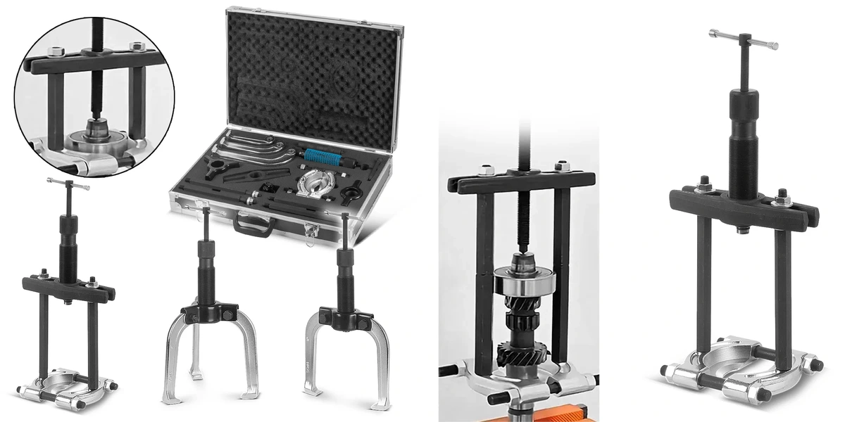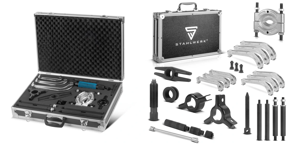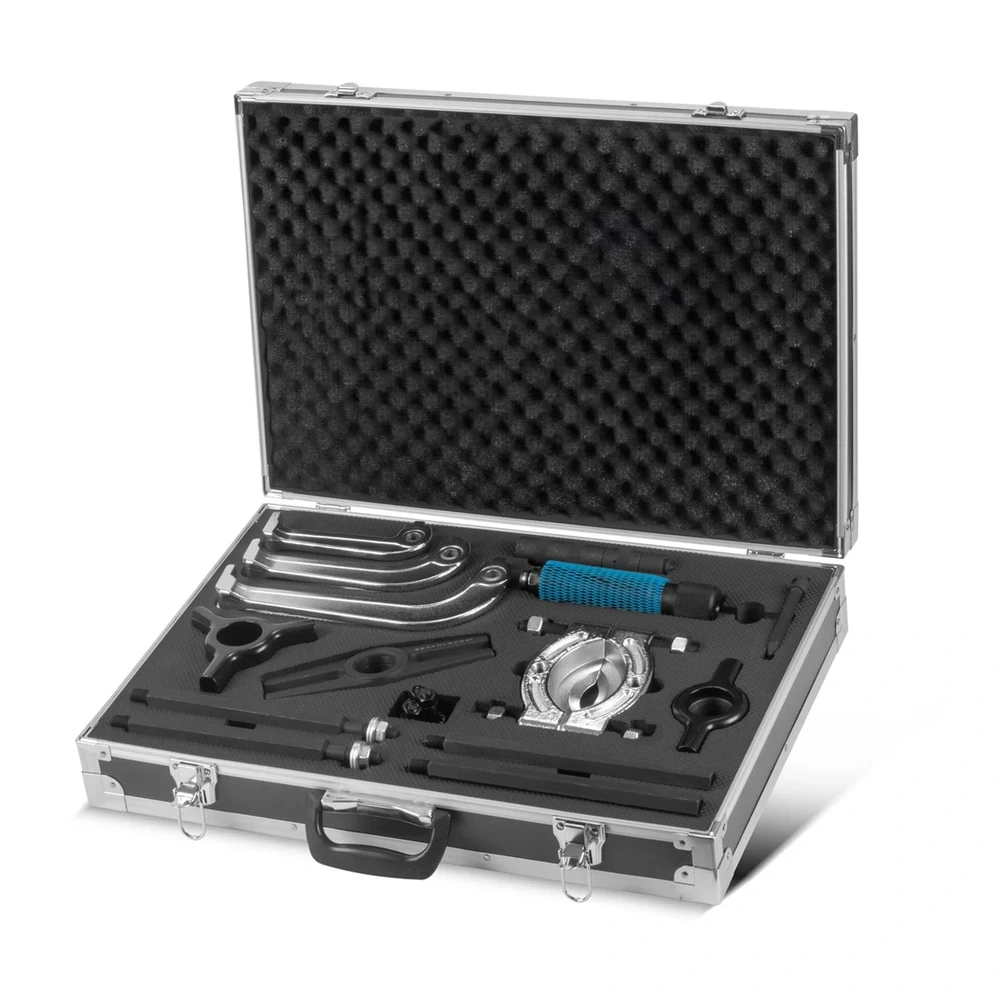 - Kompletny zestaw narzędziowy zawiera precyzyjne wrzeciono hydrauliczne, separator (ostrze tnące), jarzmo ściągacza oraz szeroki wachlarz ramion, przedłużek i adapterów.