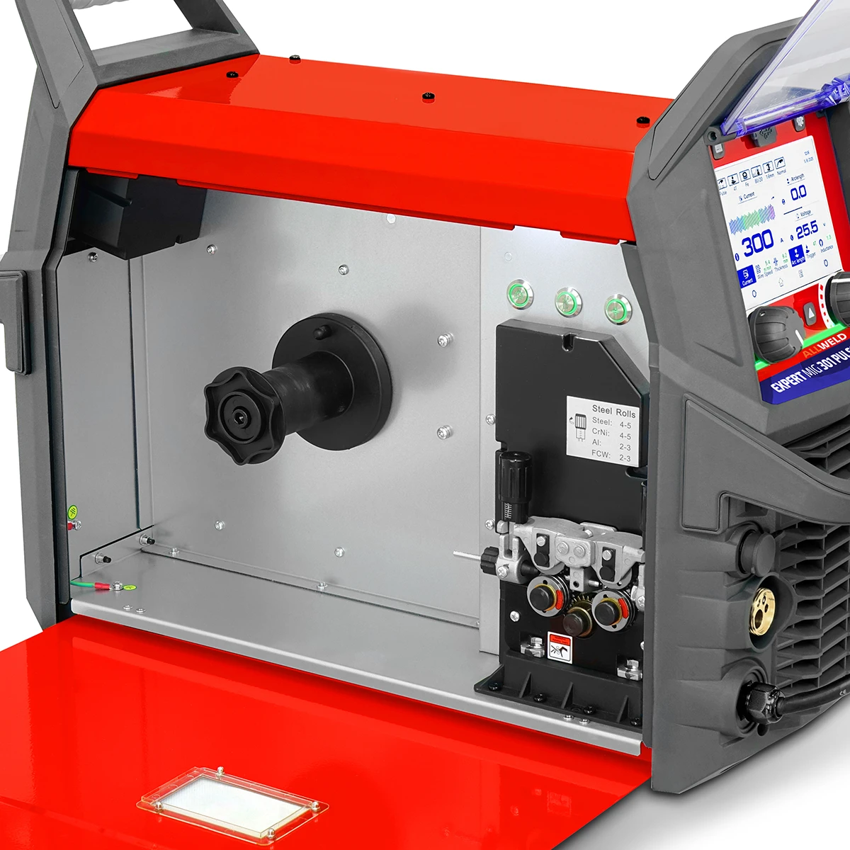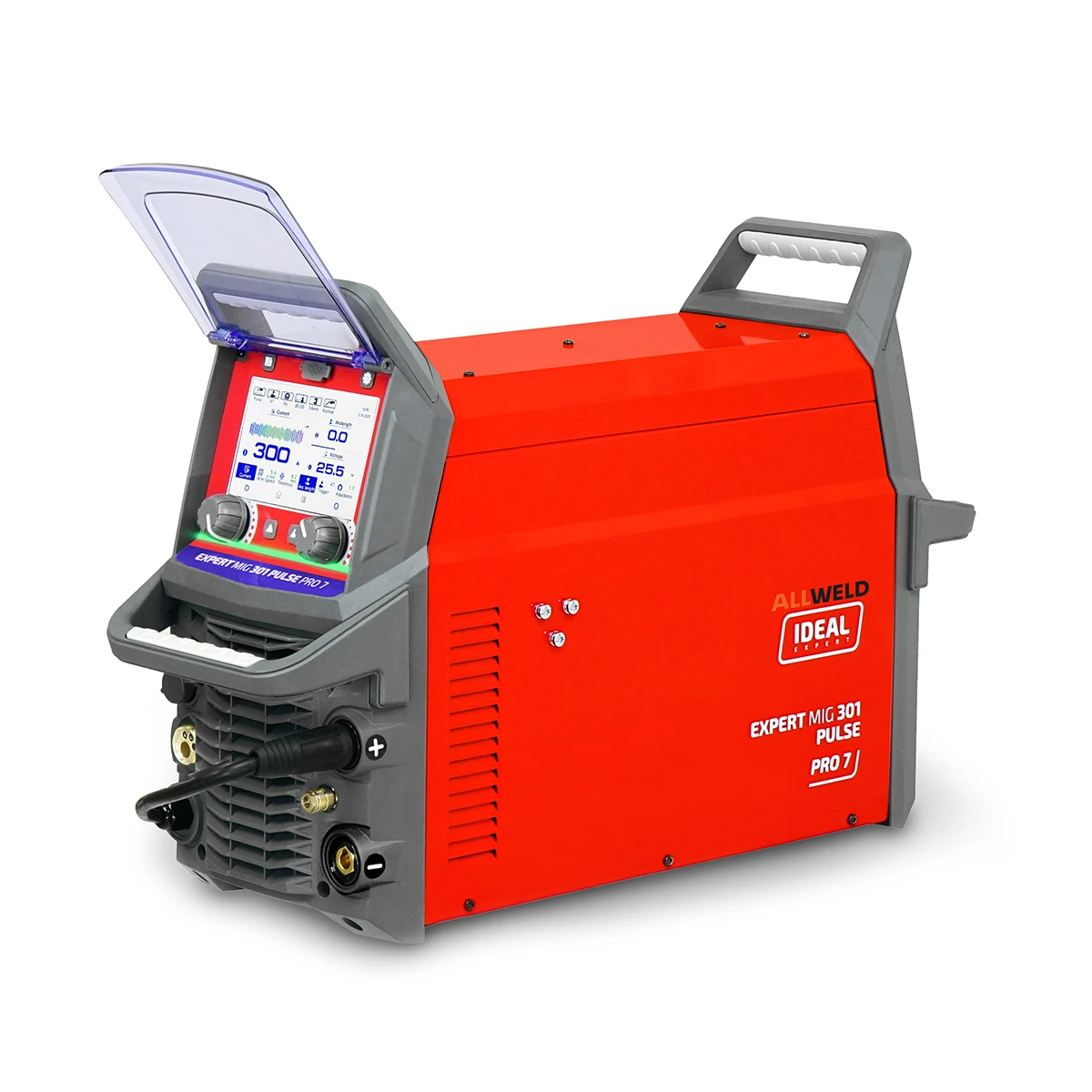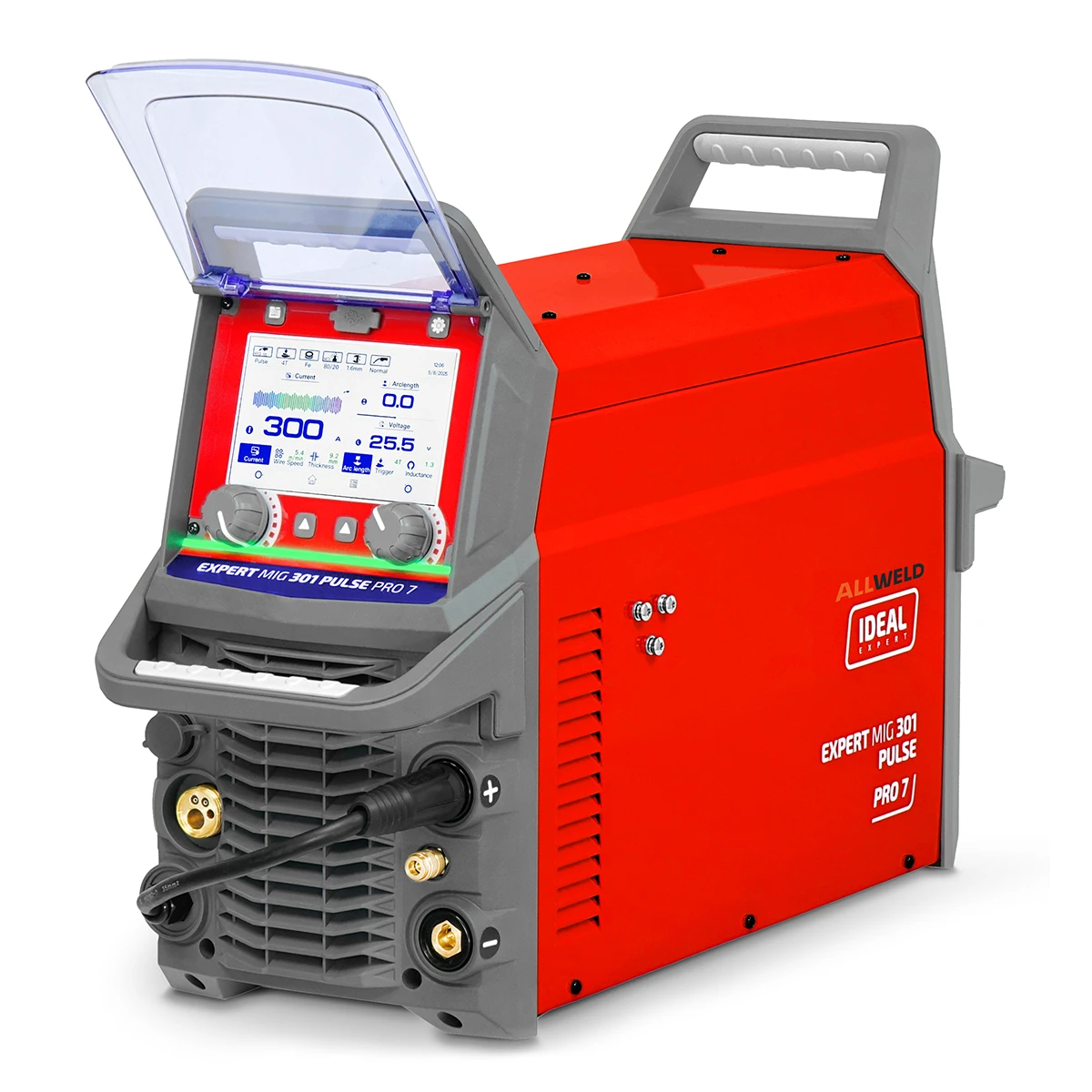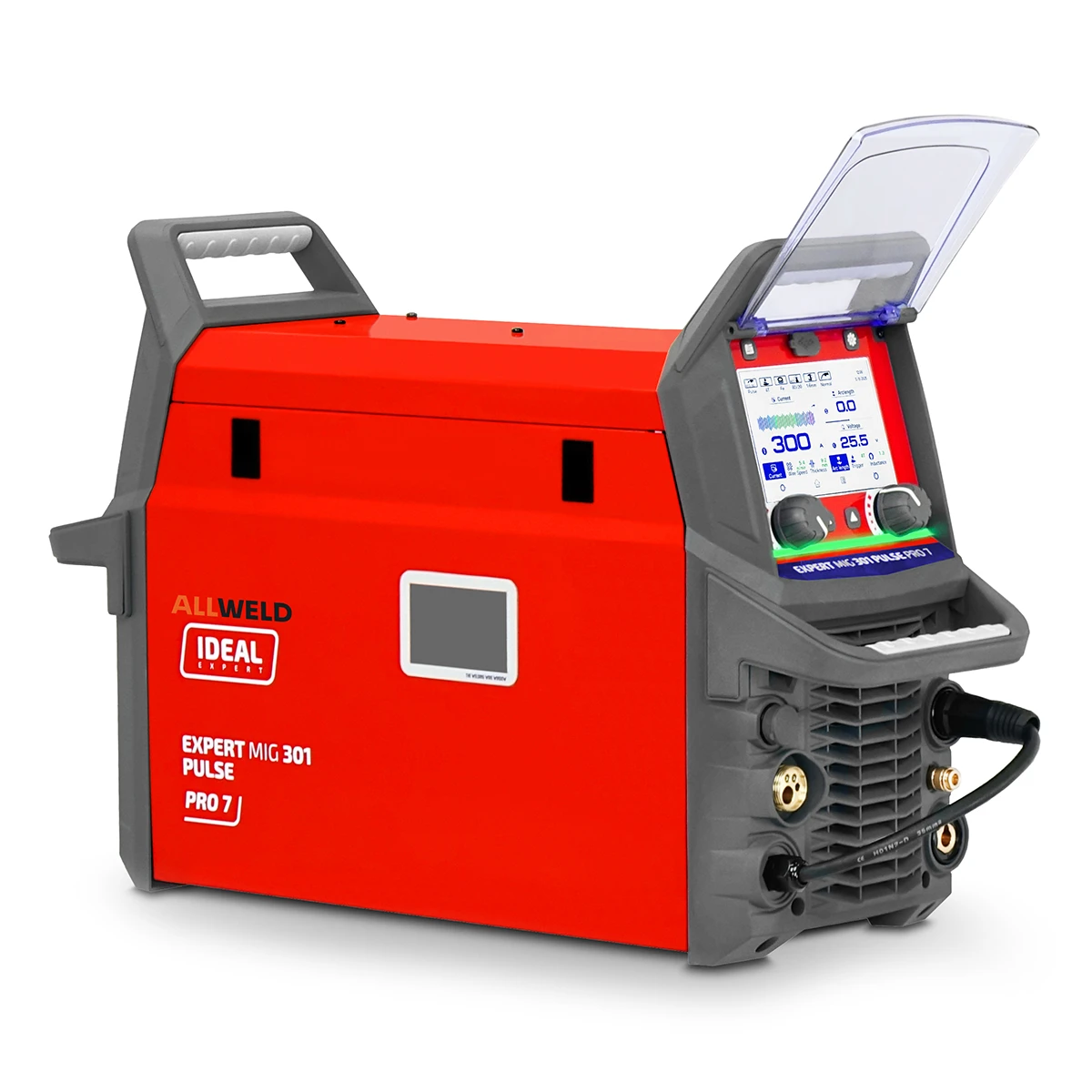 IDEAL EXPERT MIG 301 PULSE Pro to migomat klasy premium, zaprojektowany dla spawaczy oczekujących najwyższej jakości i wszechstronności. Umożliwia spawanie MIG/MAG w trybach manualnym, synergicznym, PULS i DUAL PULS, a także metody TIG DC i MMA. Wyposażony został w dotykowy ekran 7" LCD, 4-rolkowy podajnik drutu oraz zasilanie 3-fazowe 400 V, zapewnia maksymalny prąd 300 A przy cyklu pracy 60%.