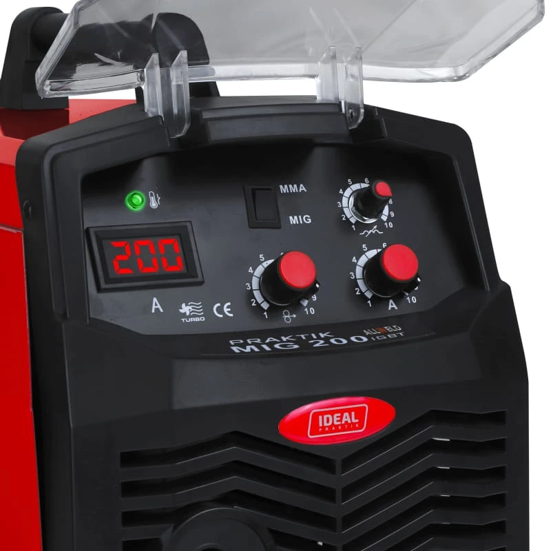 Spawarka Ideal PRAKTIK MIG 200 IGBT to inwertorowy półautomat spawalniczy do spawania metodą MIG-MAG oraz FLUX. Prąd spawania 200A. Zasilanie 230V. Średnica drutu spawalniczego 0,6-0,8mm. Podajnik drutu 2-rolkowy. Inwertorowy półautomat spawalniczy zalecany do zastosowań blacharskich i warsztatowych. Umożliwia spawanie metodą MIG-MAG drutem spawalniczym w osłonie gazu oraz metodą FLUX drutem spawalniczym samoosłonowym.