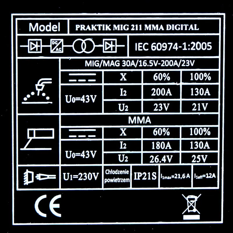| ZAKRES REGULACJI PRĄDU SPAWANIA MIG MAG [A] | 30 - 200 |