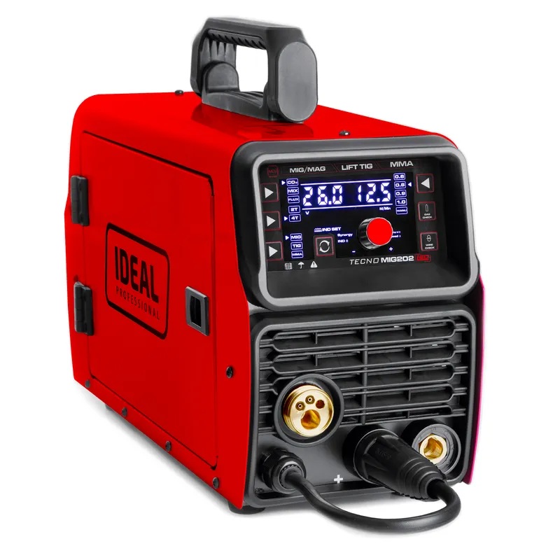 Migomat IDEAL TECNOMIG 202 to urządzenie 3w1, które można użyć do spawania metodami MIG/MAG, MMA (elektroda otulona) i TIG DC (z zajarzeniem dotykowym LIFT). Ponadto dzięki zmiennej biegunowości istnieje możliwość spawania metodą FLUX drutem proszkowym bez gazu osłonowego.