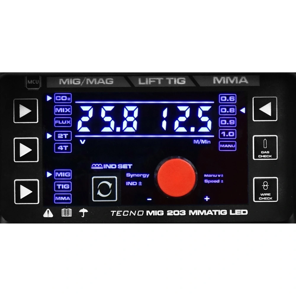 Tecno MIG 203 jest wyposażony w ergonomiczny panel sterowania z czytelnym wyświetlaczem LED. Dwa okna wyświetlacza pokazują kluczowe wartości, takie jak napięcie, prąd czy indukcyjność, a diody sygnalizują aktywne funkcje jak np. tryby spawania czy średnice drutów. Urządzenie to jest bardzo przyjazne w obsłudze również dla początkujących spawaczy. Przyciski są duże i czytelne, potencjometr działa płynnie i precyzyjnie. Model ten posiada również pamięć ustawień, przechowuje ostatnie parametry dla każdej z metody.