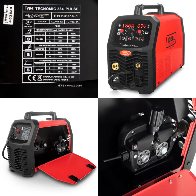 Spawarka Ideal TECNO MIG 234 Pulse 4x4 to inwertorowy półautomat spawalniczy do spawania metodą MIG-MAG MMA TIG-Lift oraz FLUX. Z maksymalnym prądem spawania 200A w 60% cyklu pracy. Urządzenie wyposażone jest w 4 rolkowy podajnik drutu dzięki czemu bez problemu urządzenie poradzi sobie z nawet 5 metrowymi uchwytami spawalniczymi. Ideal Tecno MIG 234 wyposażone jest w czytelny wyświetlacz LED oraz lekką a jednocześnie mocną obudowę.