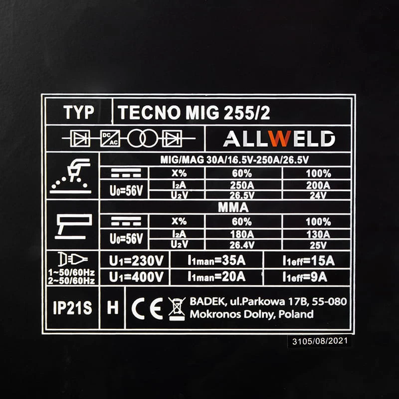 Model 255 Tecnomig wykorzystuje zaawansowaną technologię IGBT, ma mocny 4 rolkowy podajnik odlewany z aluminium. Migomat ten posiada klasyczny panel z płynną regulacją oraz czytelnymi wyświetlaczami. Niewątpliwą zaletą 255 jest możliwość regulacji indukcyjności, niezbędna przy spawaniu elementów ocynkowanych.