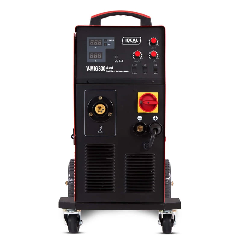 Ideal VMIG 330 4x4 Digital MMA MIG MAG - to profesjonalny inwertorowy półautomat spawalniczy. IDEAL V-MIG 330 4x4 DIGITAL MMA do spawania metodą MIG/MAG drutem spawalniczym w osłonie gazu, spawania metodą FLUX drutem spawalniczym bez gazu osłonowegometodą MMA. Doskonale sprawdza się przy spawaniu stali, stali nierdzewnej, aluminium i jego stopów. Prąd spawania 330A, zasilanie 400V, średnica drutu spawalniczego 0,6-1,2mm, podajnik drutu 4-rolkowy.