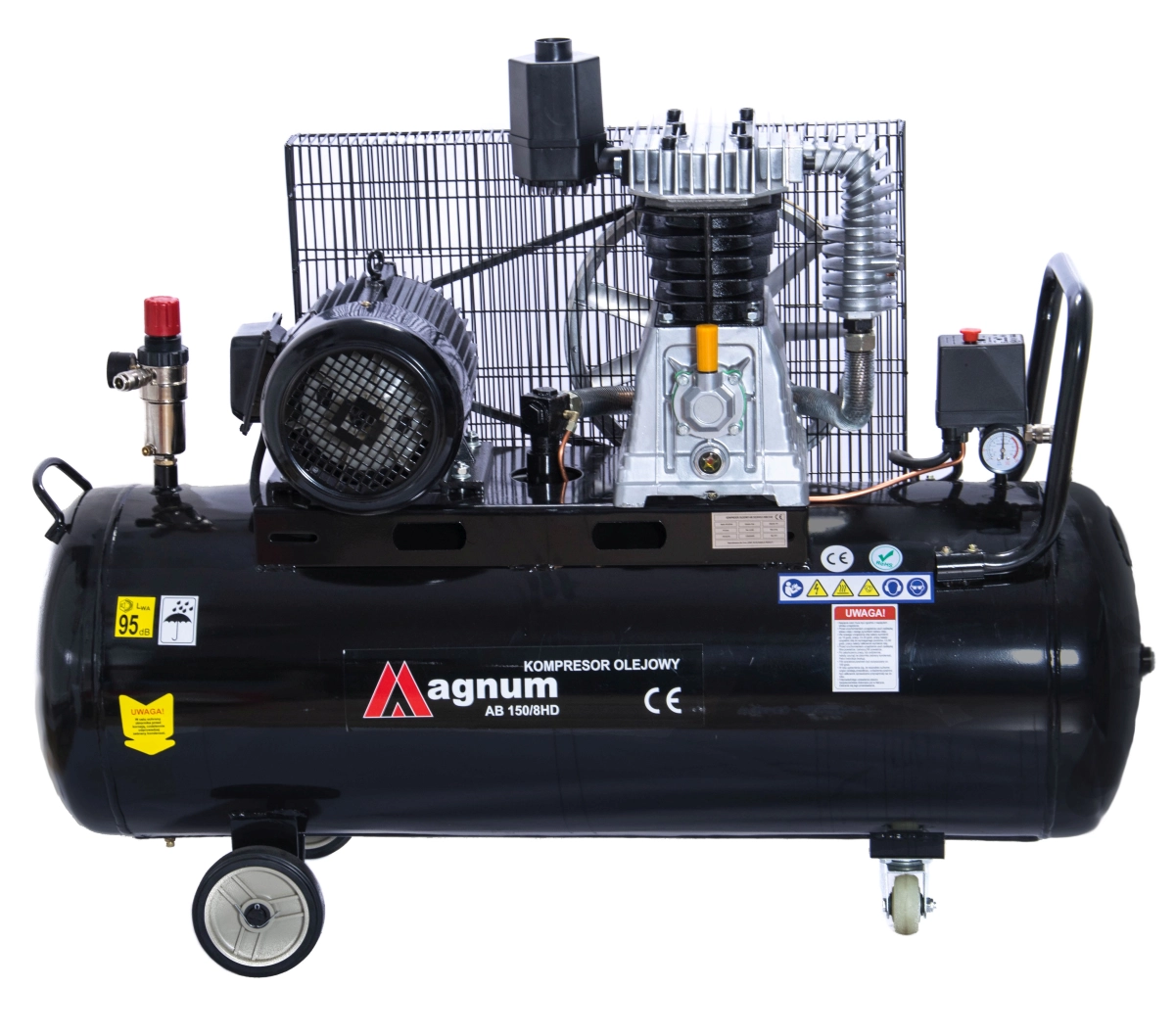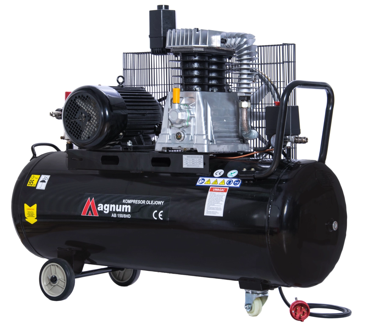 MAGNUM AB/150/HD to solidny kompresor tłokowy z napędem pasowym, zaprojektowany do intensywnej pracy w warsztatach samochodowych, zakładach rzemieślniczych oraz gospodarstwach rolnych. Urządzenie łączy w sobie potężny silnik trójfazowy o mocy 4 kW oraz wydajną pompę, co czyni go niezawodnym źródłem sprężonego powietrza do malowania, kluczy pneumatycznych, przedmuchiwania czy piaskowania.