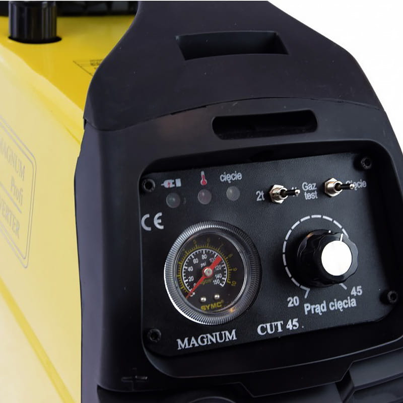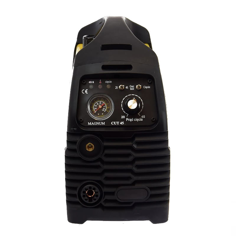 Przecinarka MAGNUM CUT 45 ma łatwy w obsłudze panel funkcyjny z pokrętłem, umożliwiającym płynną regulację prądu cięcia. Pod rękojeścią urządzenia umieszczone jest pokrętło wbudowanego filtro-reduktora służące do regulacji ciśnienia na wylocie z uchwytu plazmowego. Wystarczy ustawić ciśnienie, prąd cięcia i można zaczynać prace urządzeniem. Z tyłu urządzenia znajduje się króciec wlotowy do podłączenia przewodu doprowadzającego powietrze, wyłącznik główny oraz wyjście kabla zasilającego. Przecinarka ma w przełącznik 2T/4T oraz funkcję TEST do sprawdzania i czyszczenia instalacji powietrznej. W komplecie znajduje się także przewód masowy z zaciskiem kleszczowym.