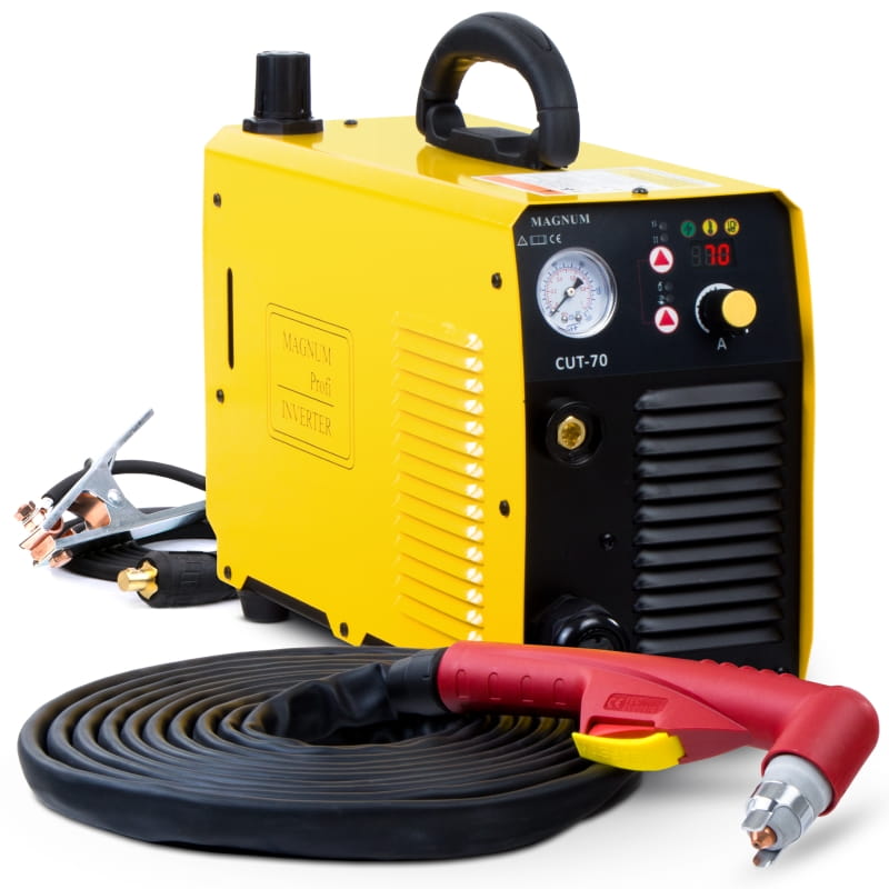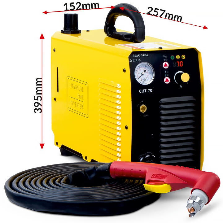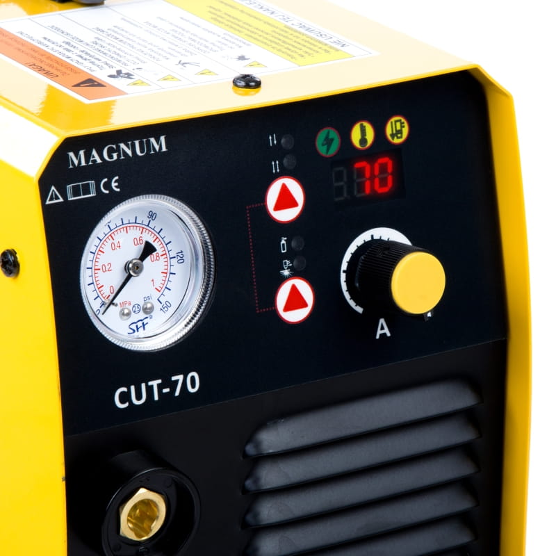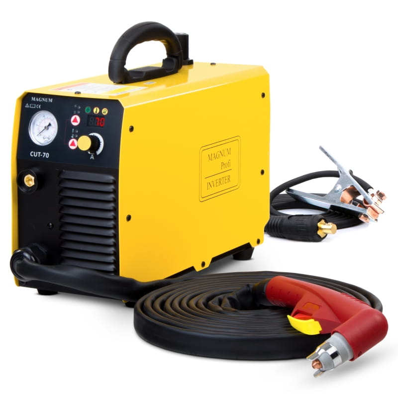 Przecinarka plazmowa Magnum CUT 70 jest przeznaczona do ręcznego lub maszynowego cięcia plazmą powietrzną elementów przewodzących prąd elektryczny, wykonanych ze stali węglowych i stopowych, aluminium i jego stopów, mosiądzu, miedzi, a także żeliwa. Model CUT 70 można dodatkowo wyposażyć w palnik maszynowy ekranowany stosowany przy stołach CNC i ploterach. Znamionowy prąd cięcia 70 A w cyklu 60% a max. grubość cięcia 22 mm.