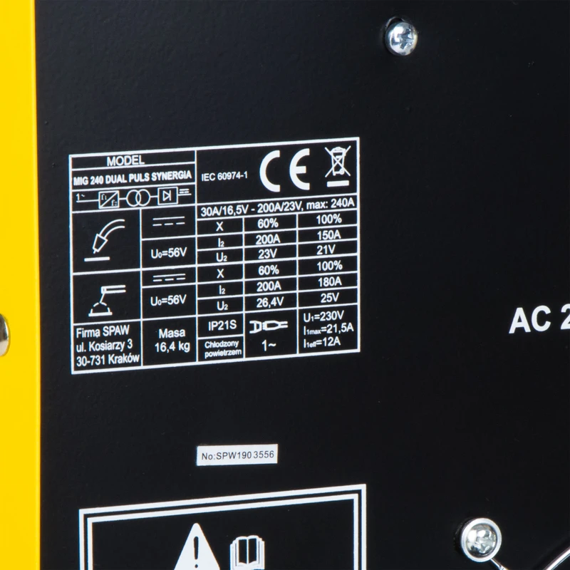 | ZAKRES REGULACJI PRĄDU SPAWANIA MIG MAG [A] | 30 ÷ 240 |