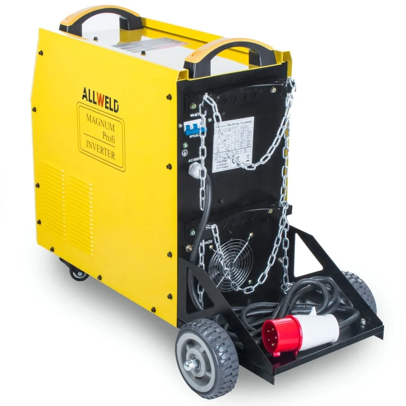PODWOZIE JEZDNE - urządzenie wyposażono podwozie jezdne, które gwarantują dużą mobilność i możliwość przemieszczania spawarki w łatwy sposób. Podwozie pozwala też na zamontowanie butli z gazem, bez konieczności inwestowania w wózek spawalniczy.