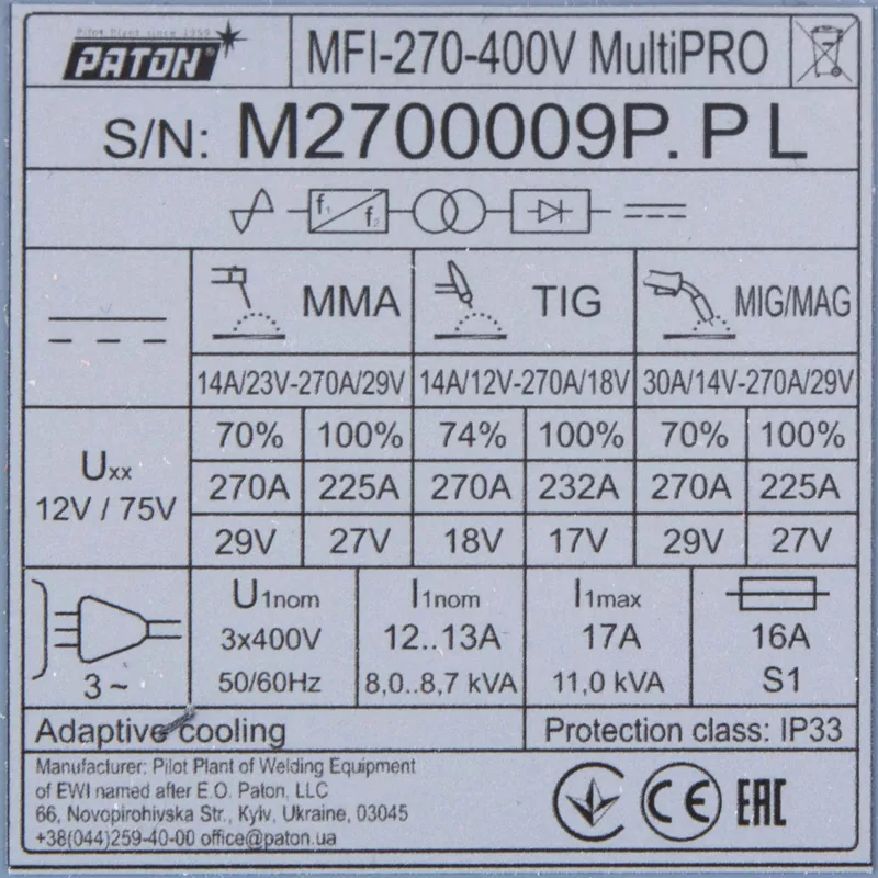 Spawarka PATON MultiPRO-270 (wcześniej MFI 270 Multipro) MIG MAG TIG HF MMA 400V 270A 15-4