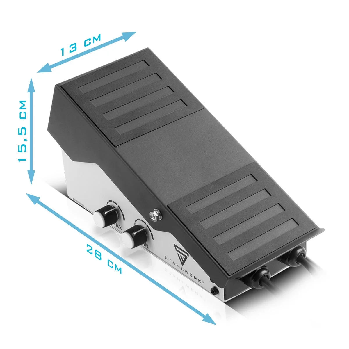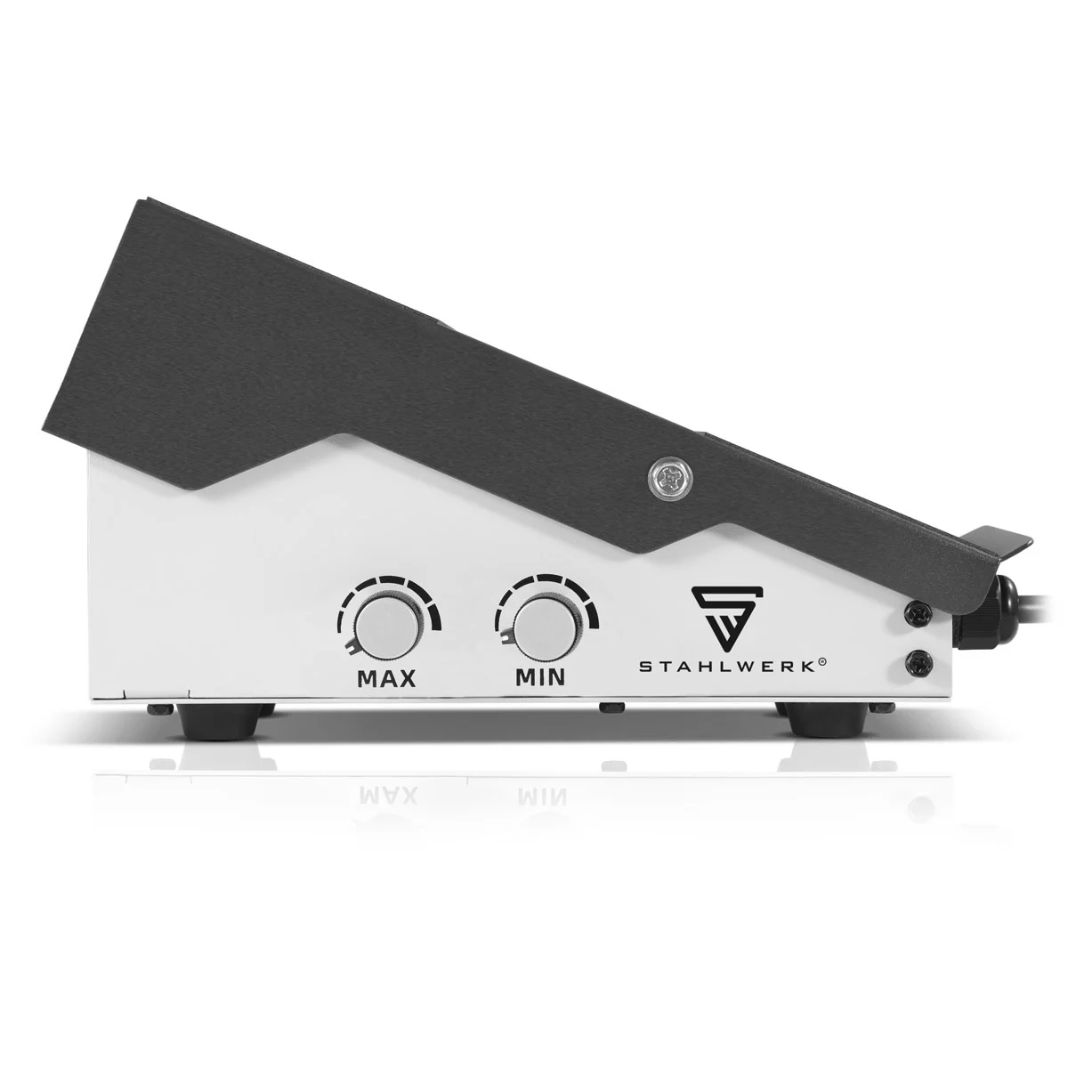 Cztery solidne gumowe nóżki stabilnie podpierają pedał, zapobiegając jego przesuwaniu się podczas pracy, a antypoślizgowa powierzchnia z wyprofilowanym wzorem zwiększa bezpieczeństwo i komfort obsługi. Ergonomiczne wyważenie urządzenia sprawia, że pedał leży naturalnie pod stopą operatora, co znacząco redukuje zmęczenie nawet przy długotrwałym spawaniu. Dzięki wytrzymałej konstrukcji, stabilnej podstawie i dopracowanej ergonomii, pedał TIG STAHLWERK umożliwia precyzyjne i płynne sterowanie prądem, co przekłada się na lepszą jakość spoin i efektywność pracy. Jest niezastąpionym dodatkiem w każdym warsztacie spawalniczym, ułatwiającym komfortową, bezpieczną i wydajną pracę przy różnego rodzaju projektach.