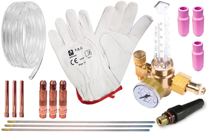 Zestaw osprzętu spawalniczego TIG do Aluminium, stali czarnej, nierdzewnej i kwasoodpornej. Zawiera niezbędne akcesoria takie jak: wysokiej klasy reduktor, wygodne i bezpieczne rękawiczki, elastyczny wężyk, oraz trwałe łączniki, elektrody, dysze i tulejki.