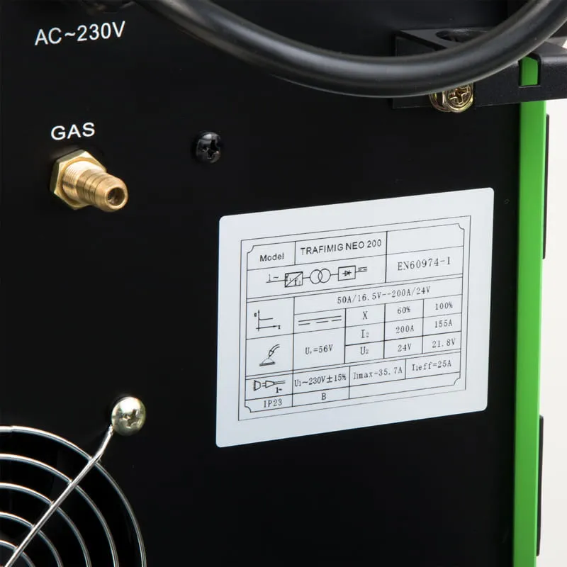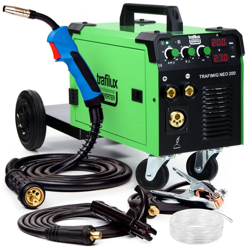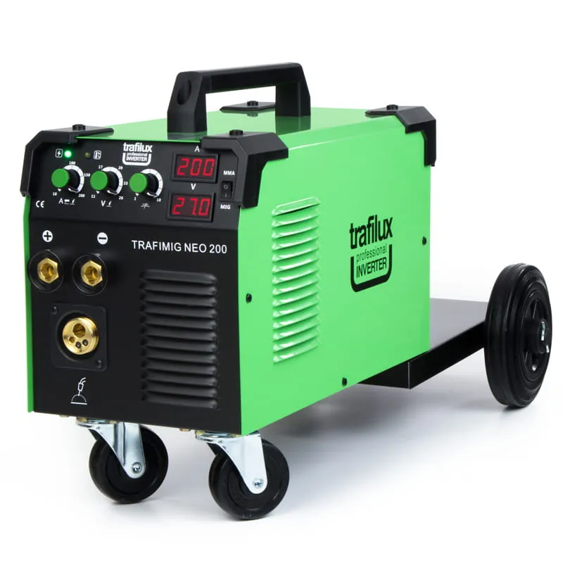 Spawarka Trafilux TRAFIMIG NEO 200 MMA MIG/MAG jest to lekki, przenośny inwerterowy półautomat spawalniczy z podwoziem jezdnym. Model NEO 200 MMA wykonany jest w technologii IGBT redukującej zużycie energii zarazem zwiększające wydajność i stabilność łuku spawalniczego. Znamionowy prąd spawania 200 A w cyklu 60 %.