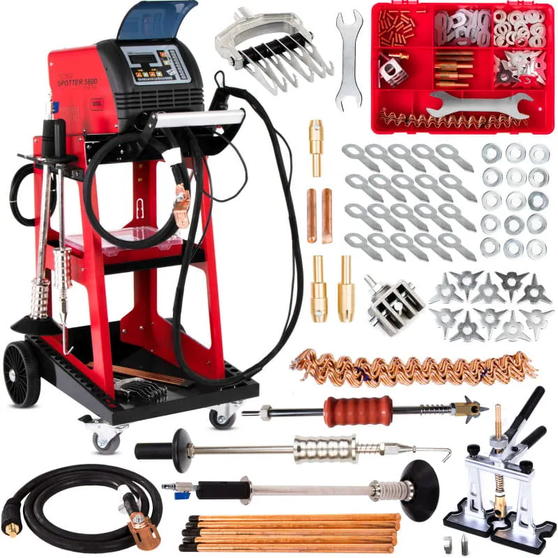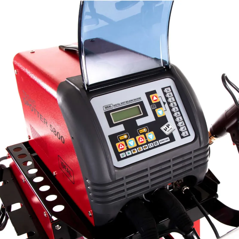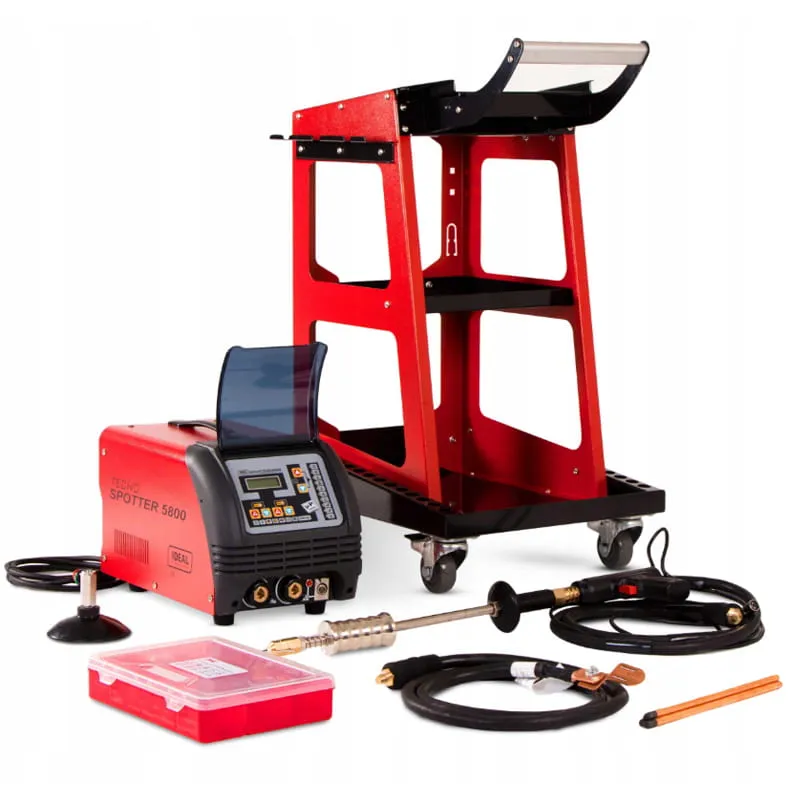 Spotter IDEAL 5800 to bardzo mocne urządzenie transformatorowe o maksymalnym prądzie zgrzewania 3800A, zasilane na 400V i mocy maksymalnej 10 kW. Urządzenie w wersji MIX ma w zestawie pełne wyposażenie, służące do kompleksowych napraw blacharskich.