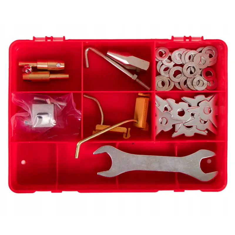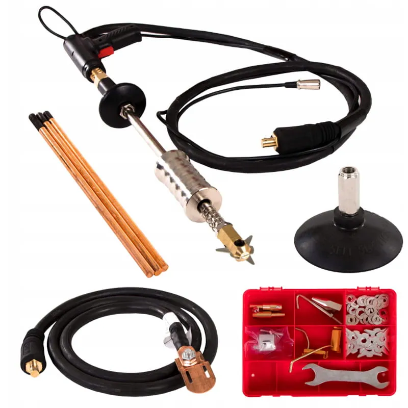 • Skrzynka z akcesoriami w tym podkładki M10 i M12 po 15 szt., podkładki trójkątne 10 szt, elektrody do bańkowania 3szt. , hak do podkładek M8-M12, wybijak z uchwytem do podkładek trójkątnych, ssawka gumowa do płytkich wgnieceń.