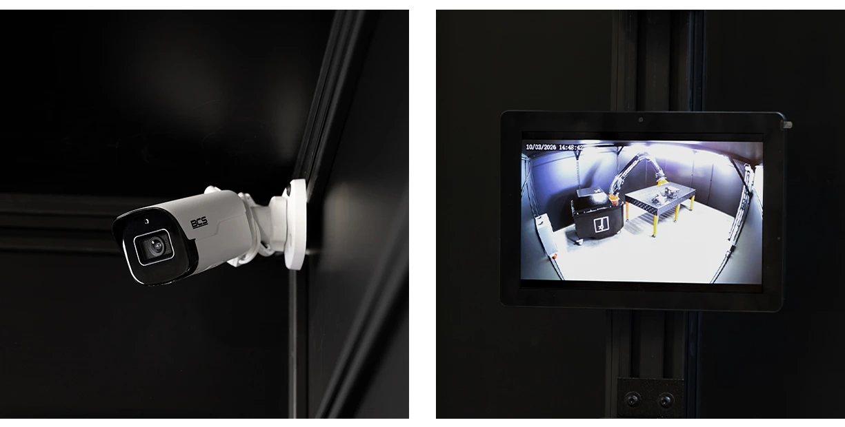 Dla zapewnienia maksymalnej kontroli nad przebiegiem prac, cela spawalnicza SPARTUS oferuje możliwość doposażenia w zaawansowany system monitoringu wizyjnego. Zastosowanie kamery wewnętrznej oraz zewnętrznego ekranu z podglądem na żywo pozwala na bieżącą obserwację procesów spawania lub czyszczenia laserowego bez konieczności przerywania bariery ochronnej i otwierania strefy roboczej. Takie rozwiązanie nie tylko podnosi poziom bezpieczeństwa, ale również znacząco ogranicza ingerencję w środowisko pracy, pozwalając na zachowanie stabilnych i bezpiecznych warunków procesowych.
