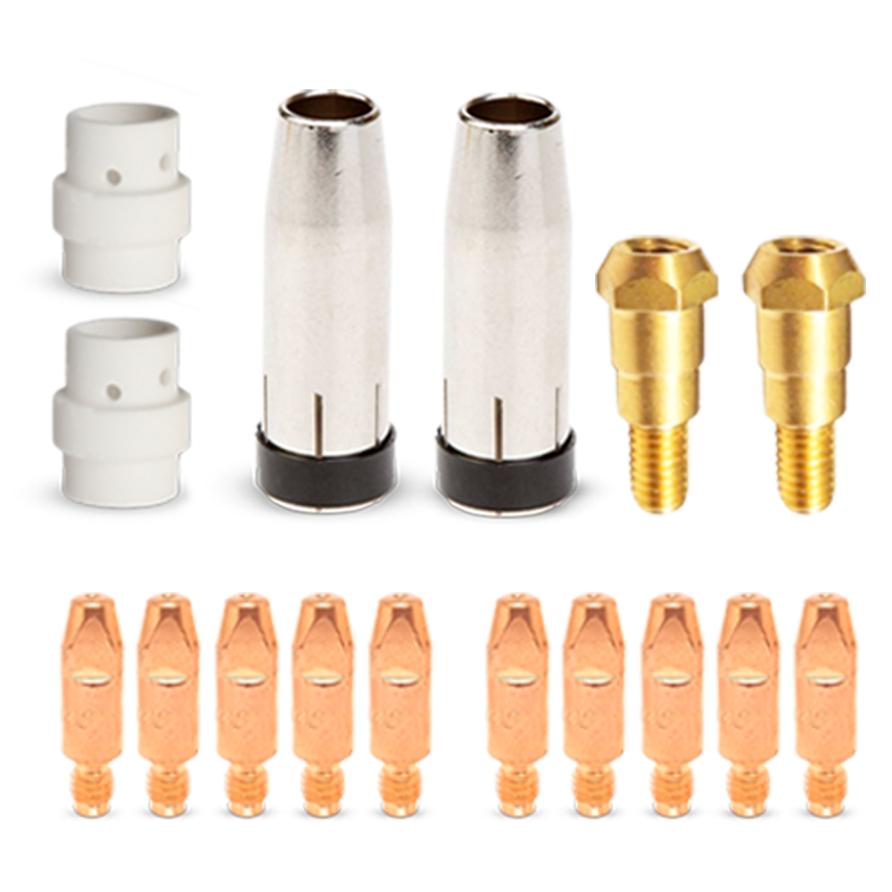 Profesjonalny zestaw osprzętu do uchwytu spawalniczego MIG/MAG MB 24. Zaleca się, aby produkty zaliczane do grupy MB 24 użytkować ze spawarkami, których maksymalne natężenie prądu wynosi 220A(Arg/CO2) - 250A(CO2). Uchwyty z serii MB 24 wykorzystywane są w kowalstwie artystycznym, ślusarstwie i branżach zajmujących się lekkimi konstrukcjami spawanymi. W skład kompletnego zestawu wchodzą wysokiej jakości dysze gazowe, łączniki prądowe, końcówki prądowe ze średnicą do wyboru oraz rozdzielacze gazu.