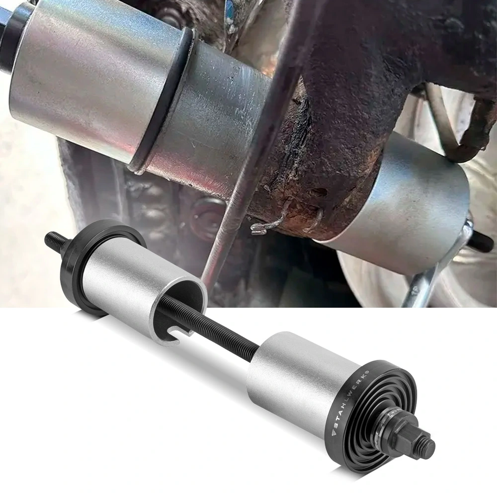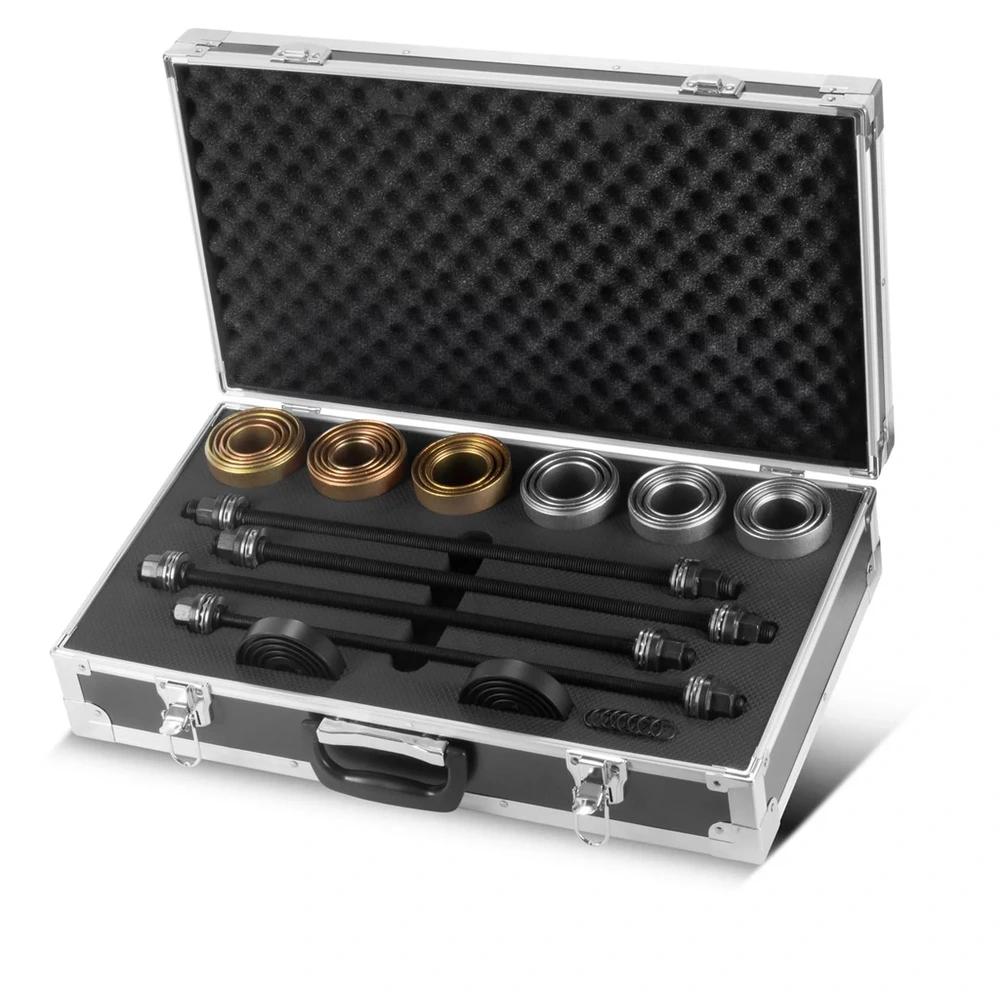 Zestaw został zaprojektowany z myślą o uniwersalności – pasuje do większości popularnych marek samochodów osobowych i dostawczych. Znajdzie zastosowanie nie tylko przy łożyskach kół, ale również przy wymianie tulei gumowo-metalowych (silentblock), sworzni oraz wielu innych elementów zawieszenia. To narzędzie, które sprawdzi się wszędzie tam, gdzie wymagana jest duża siła nacisku przy zachowaniu pełnej kontroli nad procesem demontażu.