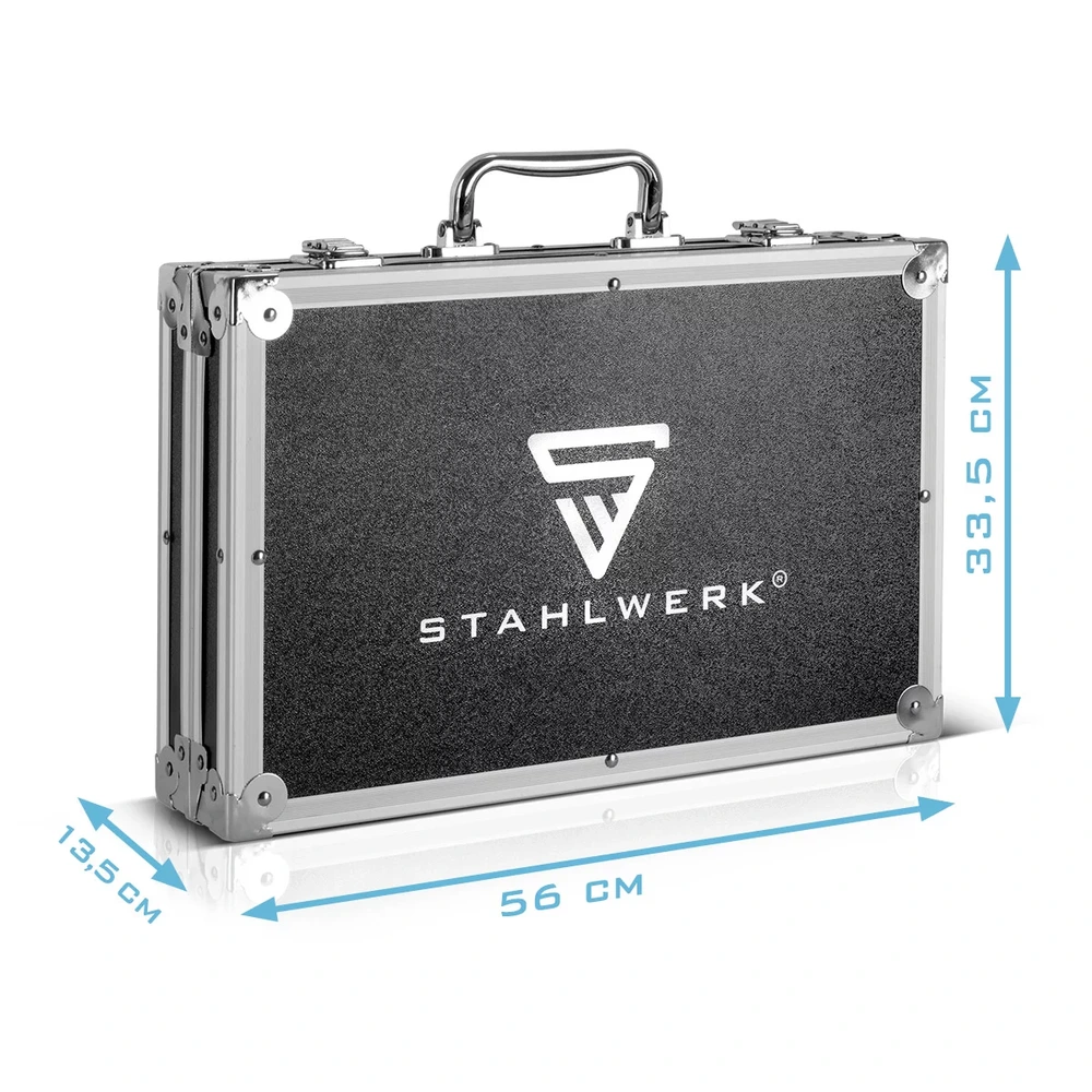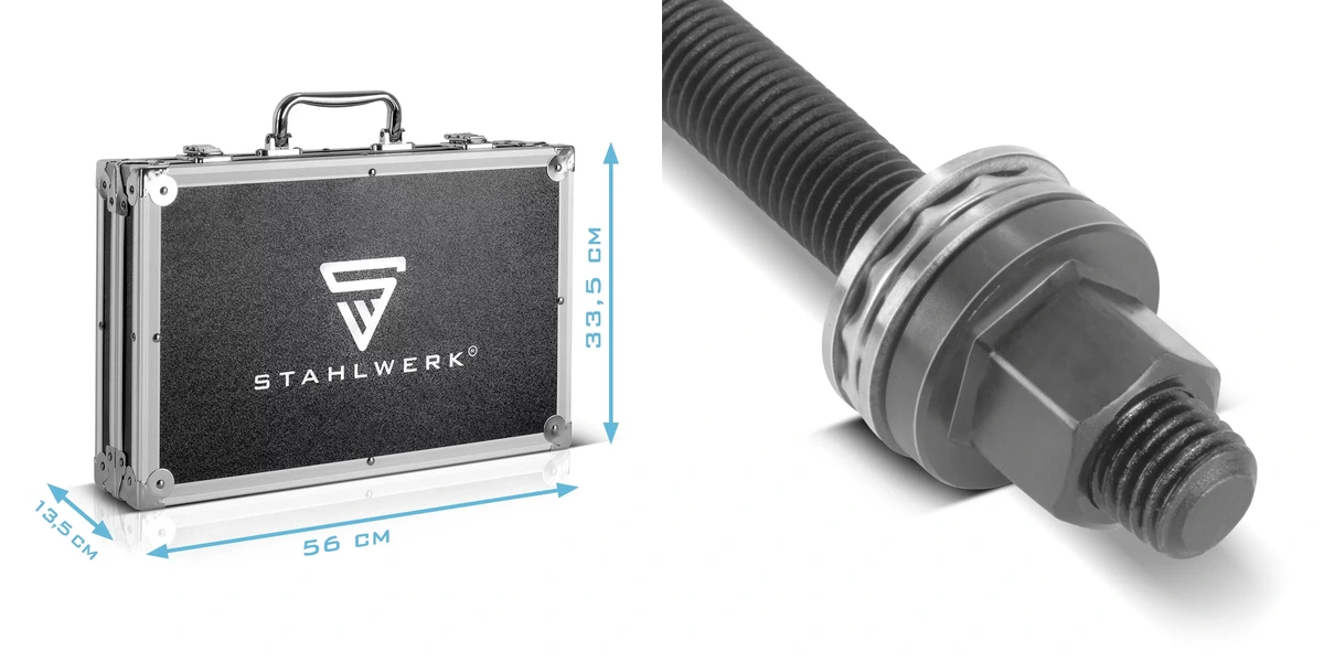 Każdy element zestawu wykonano z utwardzanej stali, co zapobiega odkształceniom pod dużym obciążeniem. Całość dostarczana jest w solidnej walizce transportowej z wytłoczonymi miejscami na każdy element, co ułatwia utrzymanie porządku w warsztacie i zapobiega gubieniu mniejszych części. Ergonomia i jakość wykonania STAHLWERK sprawiają, że nawet trudne naprawy stają się prostsze i bezpieczniejsze dla mechanika.