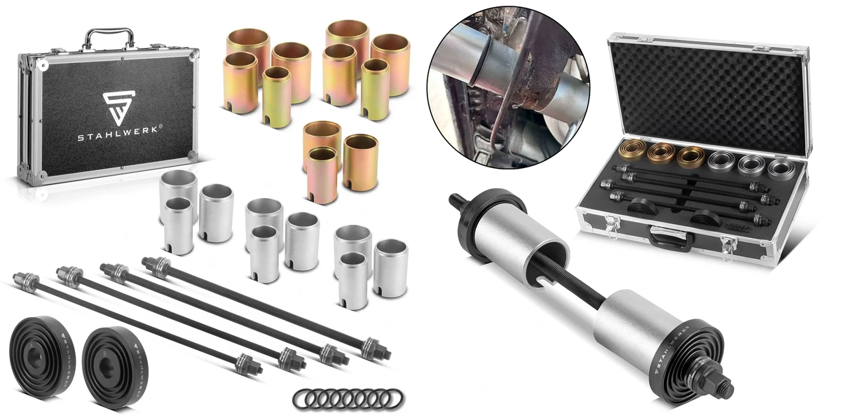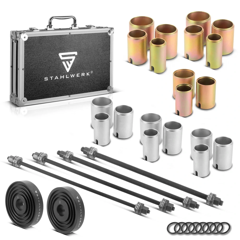 Profesjonalny zestaw narzędzi STAHLWERK to niezastąpione rozwiązanie do precyzyjnego montażu i demontażu łożysk kół oraz tulei zawieszenia. Dzięki kompaktowej i przemyślanej konstrukcji, narzędzia te pozwalają na błyskawiczną pracę bez ryzyka uszkodzenia delikatnych komponentów pojazdu. Wykorzystanie wysokiej jakości materiałów gwarantuje optymalne przenoszenie mocy, co jest kluczowe przy zapieczonych elementach podwozia.