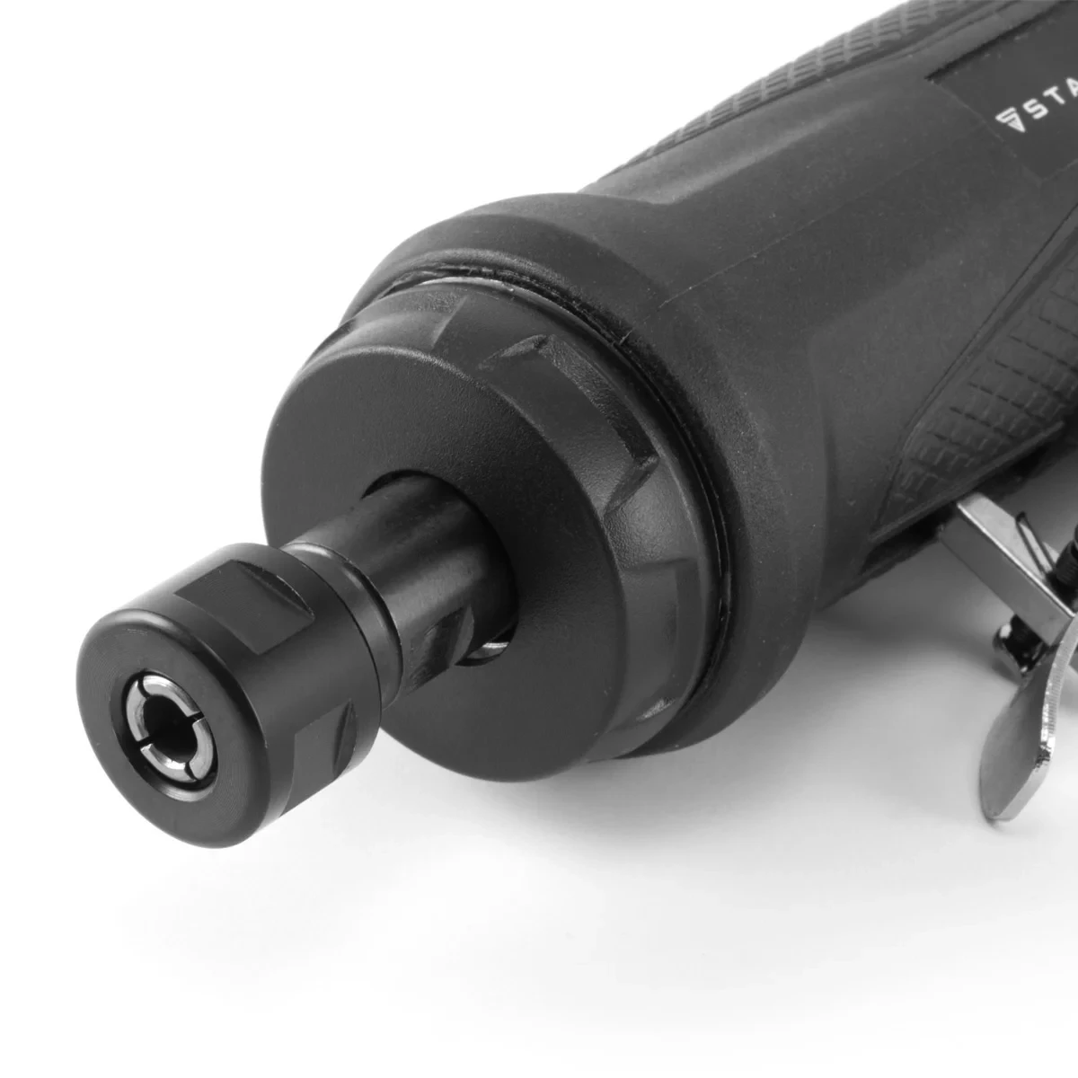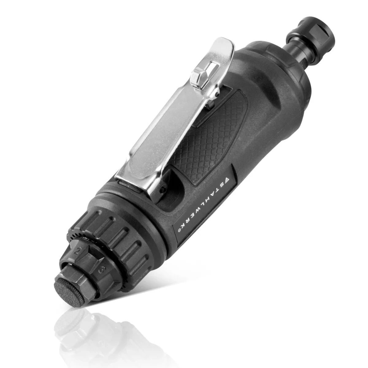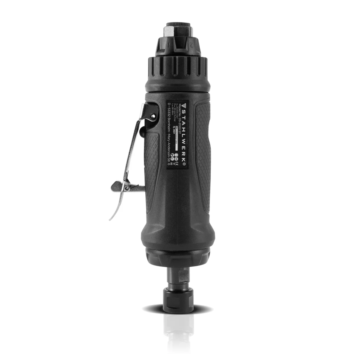 Wytrzymała pneumatyczna szlifierka kątowa STAHLWERK DS-2000 ST oferuje prędkość obrotową do 20 000 obr/min, dzięki czemu doskonale sprawdza się w precyzyjnej obróbce przy budowie modeli, form, maszyn oraz w pracach rzemieślniczych. Uchwyt narzędziowy wyposażono w uniwersalną tuleję zaciskową, umożliwiającą stosowanie różnorodnych narzędzi: frezów z węglików spiekanych, mini tarcz do cięcia, kamiennych narzędzi szlifierskich z trzpieniem 3 mm lub 6 mm, co zapewnia wszechstronność zastosowań.