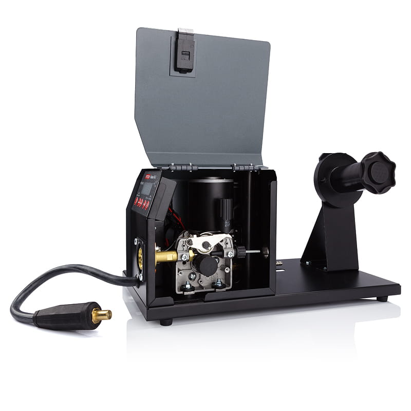 Podajnik posiada własne zasilanie silnika oraz zawór doprowadzający gaz ochronny, który automatycznie są włączane po naciśnięciu przycisku uchwytu spawalniczego.