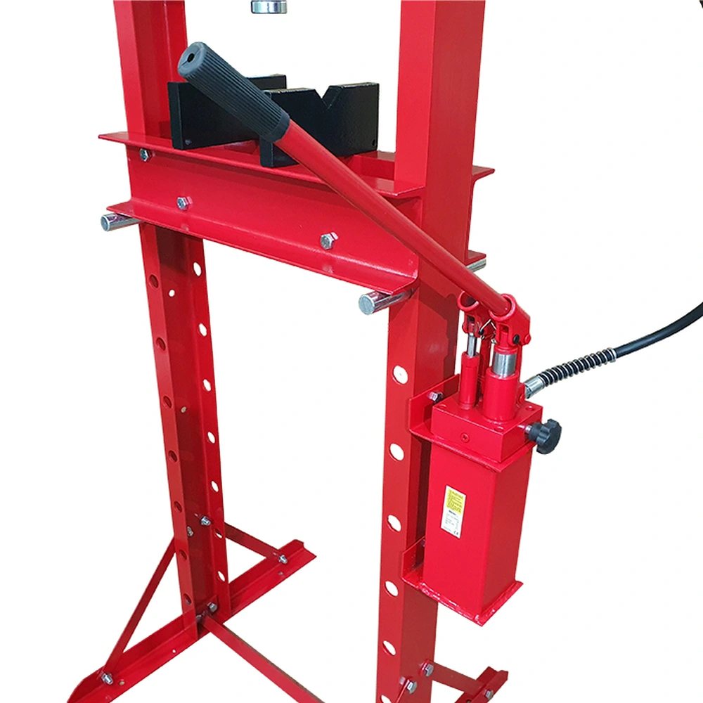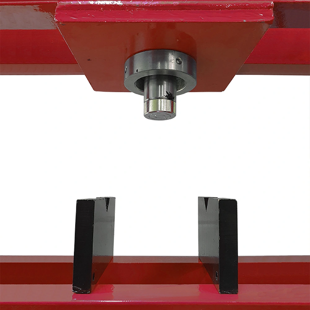 Prasa została wyposażona w hydrauliczny siłownik z dwustopniową pompą ręczną, co umożliwia wysuw tłoka z dwiema prędkościami – szybkim do wstępnego dojazdu oraz wolniejszym do precyzyjnego ściskania. Manometr wyskalowany w tonach pozwala na bieżąco kontrolować siłę nacisku, zwiększając bezpieczeństwo i dokładność pracy. Przesuwny tłok ułatwia obróbkę elementów o złożonych kształtach lub dużych gabarytach, bez konieczności skomplikowanego pozycjonowania.