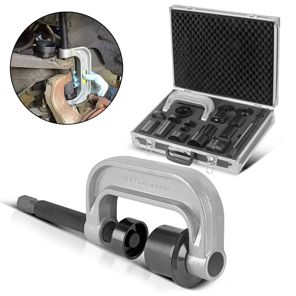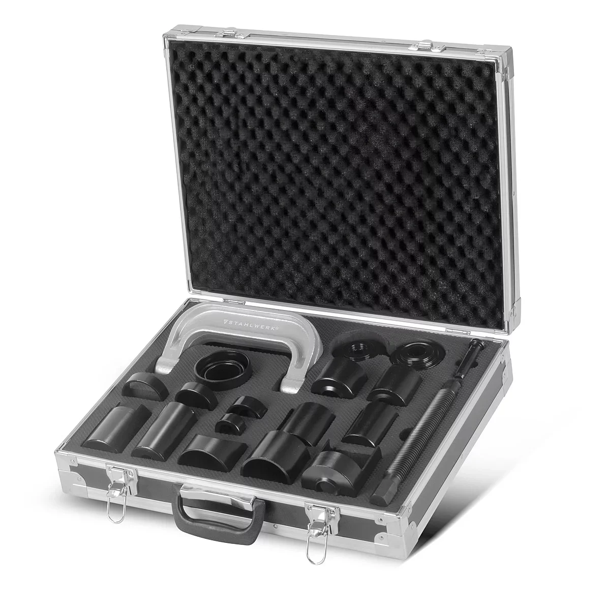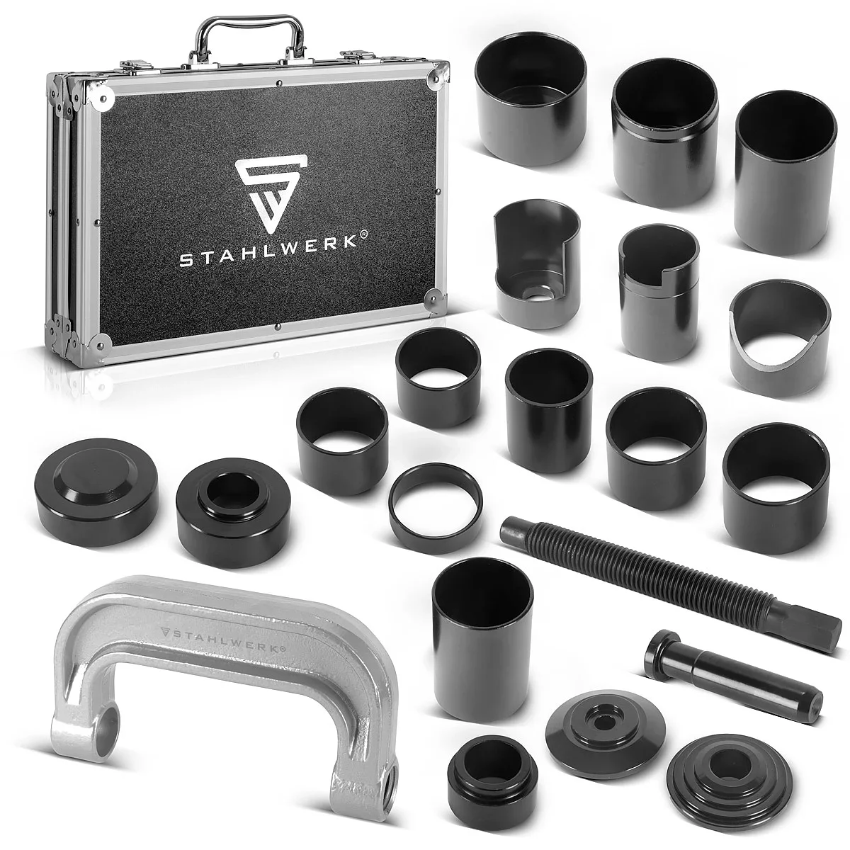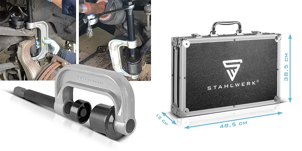 21-częściowy zestaw montażowy do pojazdów STAHLWERK stanowi kompletne rozwiązanie do prac związanych z montażem, demontażem, konserwacją oraz naprawą tulei zawieszenia, łożysk zawieszenia, przegubów zawieszenia i przegubów kulowych. Starannie dobrane elementy zestawu umożliwiają precyzyjne i bezpieczne wykonywanie prac serwisowych przy układach zawieszenia w różnych typach pojazdów. Dzięki kompaktowej i przemyślanej konstrukcji ściągacz do przegubów kulowych pozwala na szybki i kontrolowany demontaż poszczególnych komponentów bez ryzyka uszkodzenia sąsiednich elementów pojazdu.