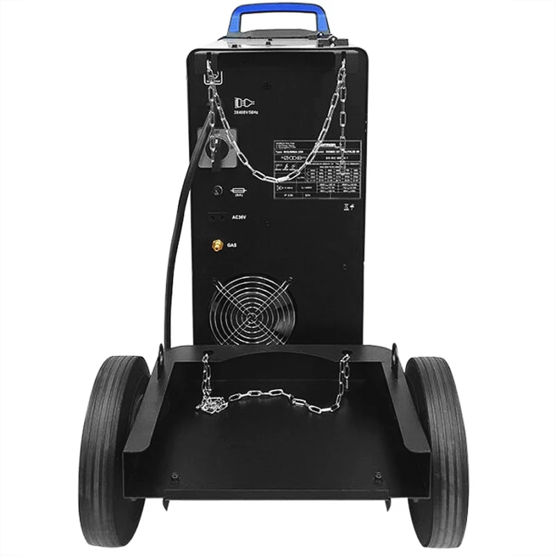 PODWOZIE JEZDNE – zazwyczaj montowane w tych większych urządzeniach, choć znajdziemy również w tych spawarkach z przedziału mocy do 200 A. Podwozie wyposażone w miejsce na butle wraz z łańcuchem do jej stabilnego mocowania.