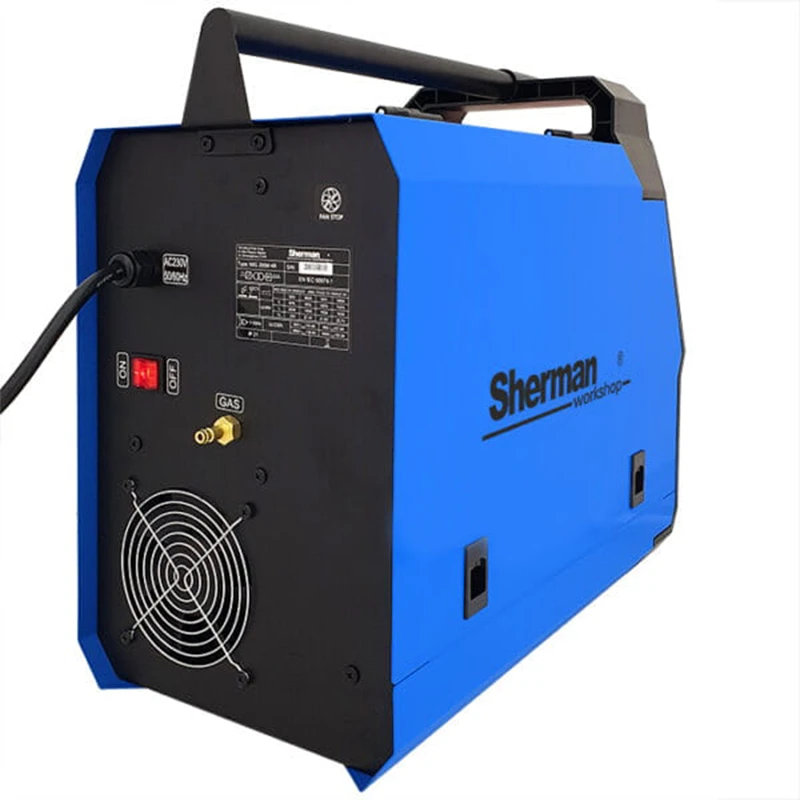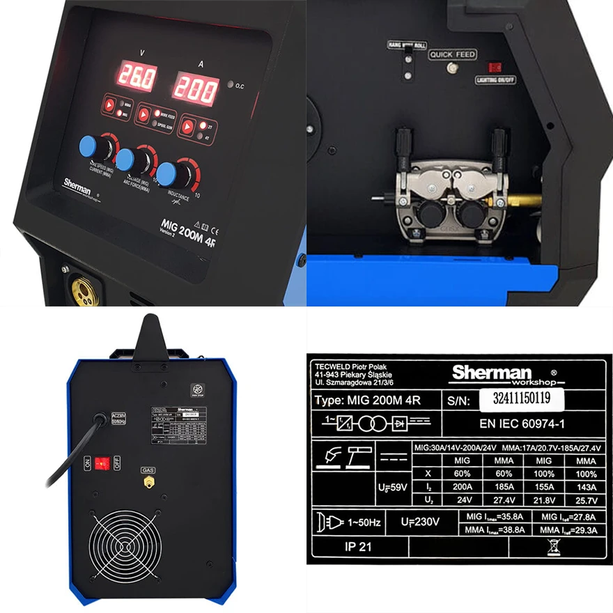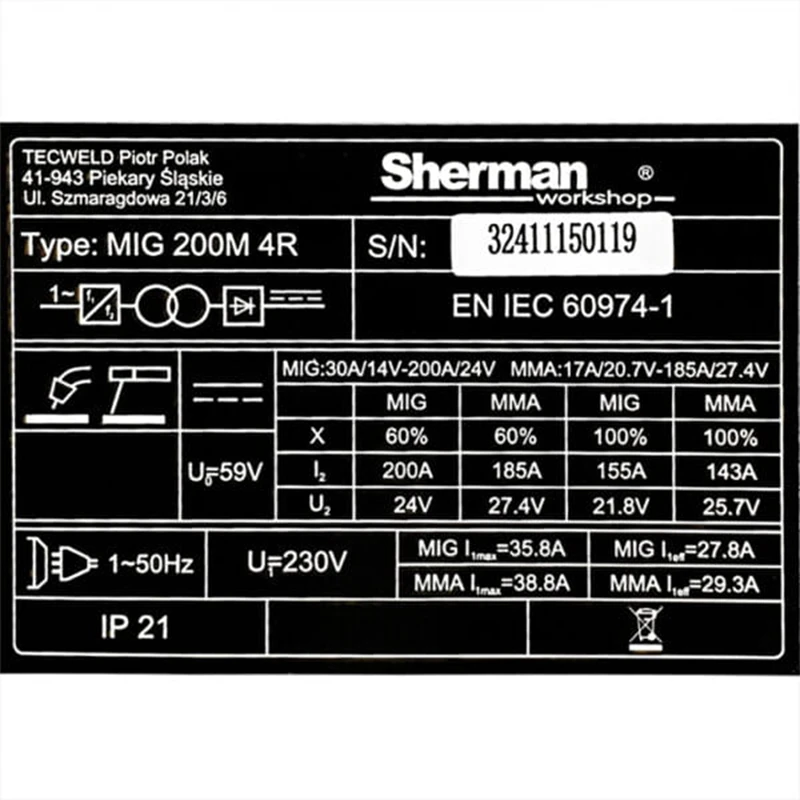 Urządzenie Sherman MIG 200 M posiada płynną regulację napięcia/prądu spawania, prędkości podawania drutu oraz indukcyjności. Przy spawaniu metodą MMA umożliwia korzystanie z funkcji ARC FORCE. Współpracuje ze szpulami drutu D200 (5 kg). Zasilane jest z sieci jednofazowej 230V 50Hz. Opcjonalnie możliwe jest równoległe podłączenie drugiego uchwytu typu Spoolgun z zamontowanym w nim mini podajnikiem drutu i szpulą D100 drutu stalowego lub kolorowego.