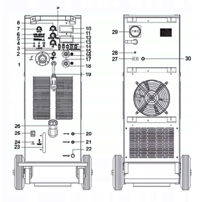 - Funkcje: 2T/4T, Regulacja indukcyjności, Podajnik 4-rolkowy, Opcja Spool Gun, Zintegrowana chłodnica