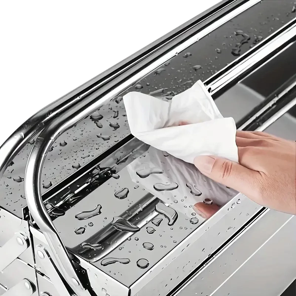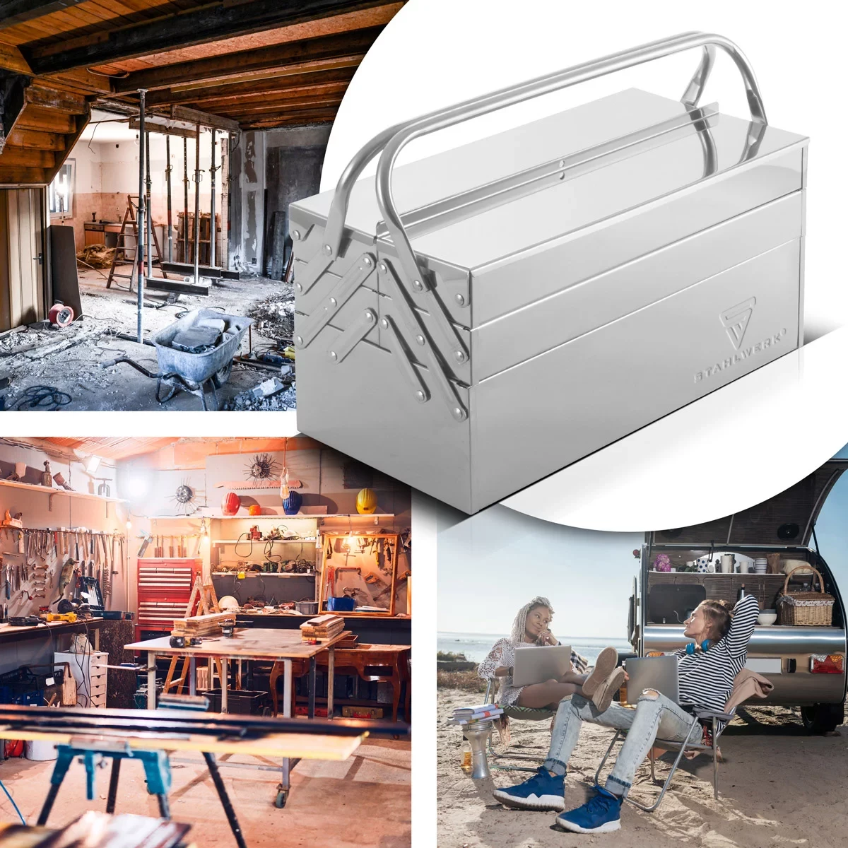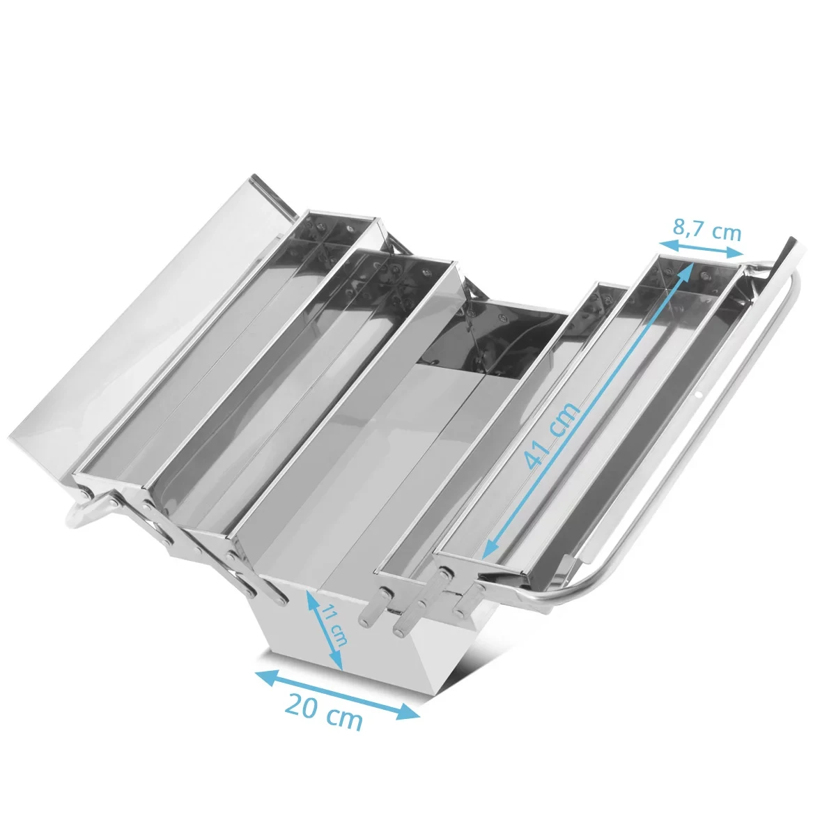 Rozkładana konstrukcja skrzynki narzędziowej pozwala na wysunięcie jej na boki, a następnie złożenie do kompaktowych rozmiarów, co znacząco oszczędza miejsce podczas transportu i przechowywania. Automatyczny mechanizm zamykania aktywowany po podniesieniu podwójnego uchwytu skutecznie zapobiega przypadkowemu otwarciu skrzynki i rozsypaniu zawartości. Ergonomiczny, podwójny uchwyt zapewnia stabilne i komfortowe przenoszenie nawet przy pełnym obciążeniu. Dzięki wysokiej jakości wykonania i uniwersalnemu charakterowi skrzynka narzędziowa ze stali nierdzewnej jest odpowiednia do zastosowań w przemyśle, handlu, warsztatach, przy pracach montażowych oraz w zastosowaniu domowym.