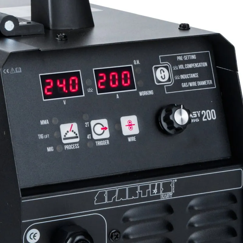 Spartus Easy MIG 200 umożliwia spawanie metodą MIG/MAG, MMA oraz TIG Lift. Urządzenie znajdzie zastosowanie w warsztatach ślusarskich, warsztatach naprawczych lub prostych pracach montażowych. Model Easy 200 umożliwi łączenie stali niskostopowych, niestopowych, jak też: magnezu, aluminium, niklu, miedzi i ich stopów. MIG/MAG to metoda spawania wykorzystująca łuk elektryczny wytwarzany pomiędzy elektrodą topliwą (którą jest drut podawany w sposób ciągły) a spawanym materiałem. Proces ten odbywa się w osłonie gazów aktywnych lub obojętnych. Najczęściej w tym celu wykorzystuje się: dwutlenek węgla, hel lub argon.