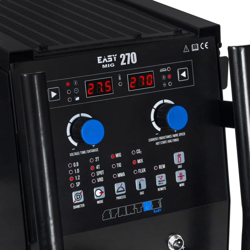 Spartus Easy MIG 270 umożliwia spawanie metodą MIG/MAG, MMA oraz TIG Lift. Urządzenie znajdzie zastosowanie w warsztatach ślusarskich, warsztatach naprawczych lub prostych pracach montażowych. Model Easy MIG 270 umożliwi łączenie stali niskostopowych, niestopowych, jak też: magnezu, aluminium, niklu, miedzi i ich stopów. MIG/MAG to metoda spawania wykorzystująca łuk elektryczny wytwarzany pomiędzy elektrodą topliwą (którą jest drut podawany w sposób ciągły) a spawanym materiałem. Proces ten odbywa się w osłonie gazów aktywnych lub obojętnych. Najczęściej w tym celu wykorzystuje się: dwutlenek węgla, hel lub argon.
