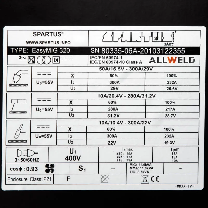 Spawarka SPARTUS EASYMIG 320 to spawarka 3w1, którą można użyć do spawania metodami MIG/MAG, MMA (elektroda otulona) i TIG DC (z zajarzeniem dotykowym LIFT). Urządzenie pozwala na spawanie prądem maksymalnym 300A, zapewniając doskonałej jakości spoinę.