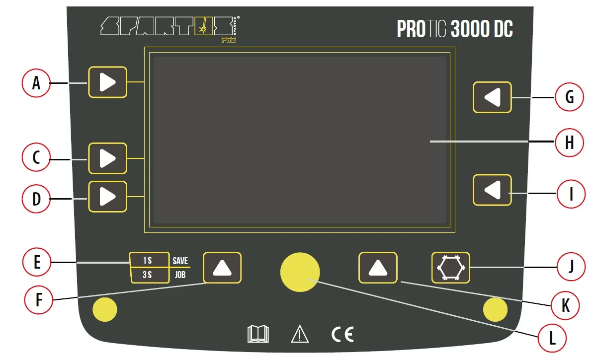 D Przycisk wyboru funkcji spawania: Pulse/No Pulse/SingleSPOT/MultiSPOT