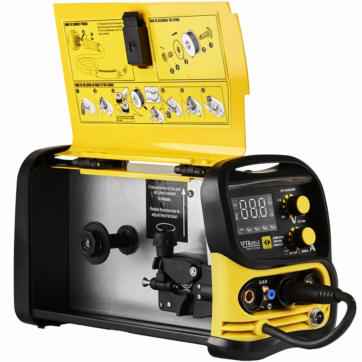 Urządzenie umożliwia pracę w trzech metodach spawalniczych: MIG, MMA, TIG LIFT oraz bez użycia gazu, co znacząco podnosi jego uniwersalność i pozwala dopasować technikę spawania do konkretnego materiału oraz specyfiki zadania. Operator może swobodnie wybrać tryb pracy w zależności od potrzeb i wymagań technicznych. Spawarka zapewnia łatwe zajarzenie łuku, stabilny przebieg procesu oraz minimalny rozprysk, co przekłada się na wysoką jakość i czystość wykonywanych spoin.