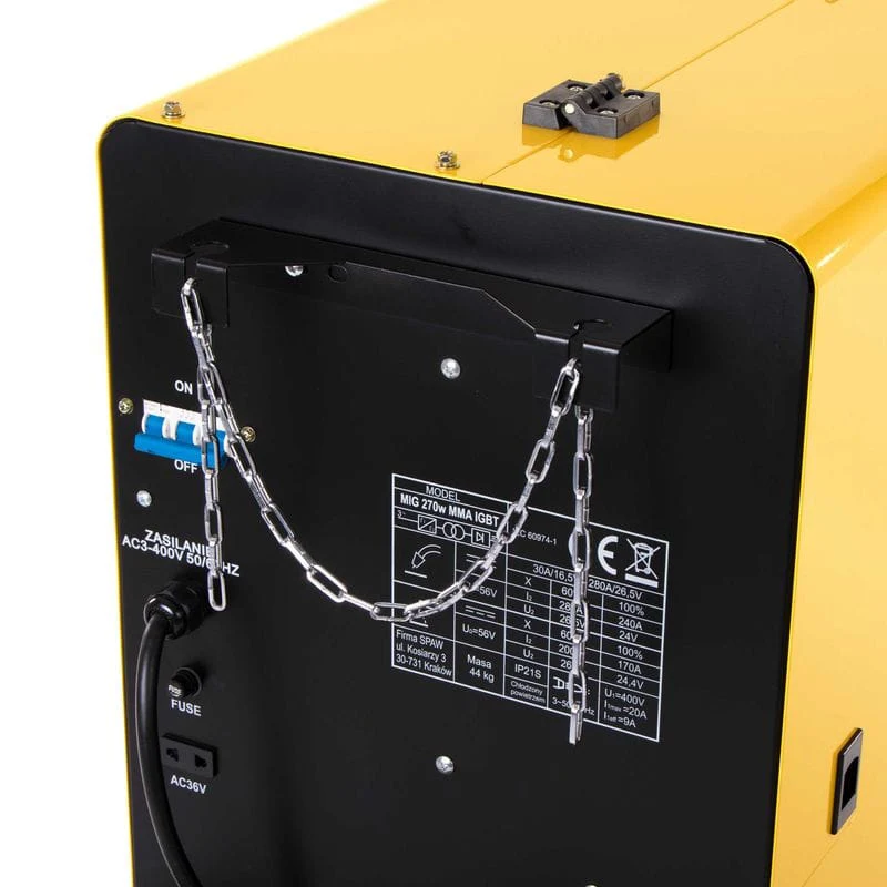 Model 270 W jest jednym z najpopularniejszych urządzeń na rynku, wyróżnia go niska awaryjność i solidna konstrukcja. Doskonałym wybór dla warsztatów, gospodarstw i firm produkcyjnych dla których moc 280 A czyli możliwość spawania materiałów do grubości 15 mm w cyklu 60% jest wystarczająca. Dodatkowym atutem spawarki są niskie wymagania dla zabezpieczenia prądowego na poziomie 16A typu C.