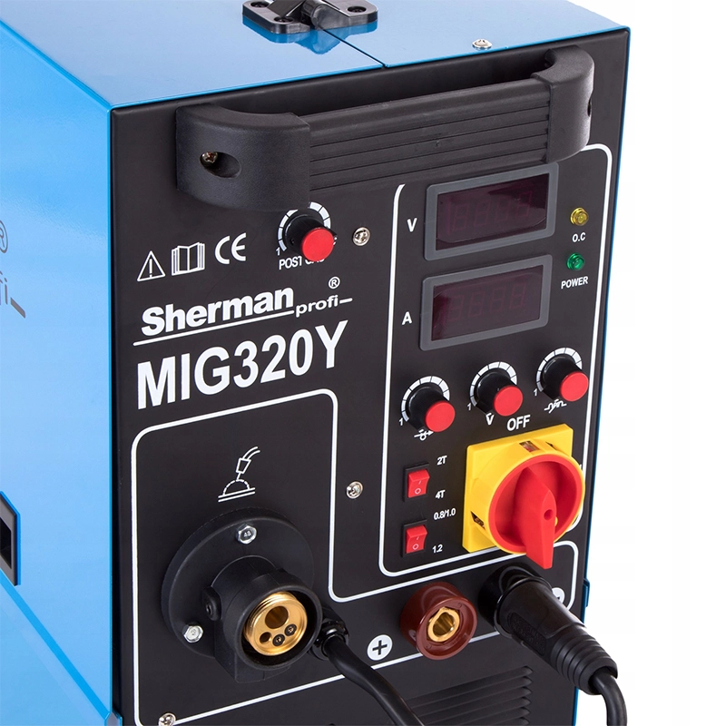 SHERMAN MIG 320Y ma proste i łatwe w obsłudze sterowanie za pomocą trzech dedykowanych do tego pokręteł. Każdy odpowiada za inny parametr i pozwala na precyzyjne ustawienie pożądanej wartości. Dodatkowo, z panelu sterowania za pomocą dedykowanych przycisków można ustawić grubość drutu i wybrać metodę 2T bądź 4T.