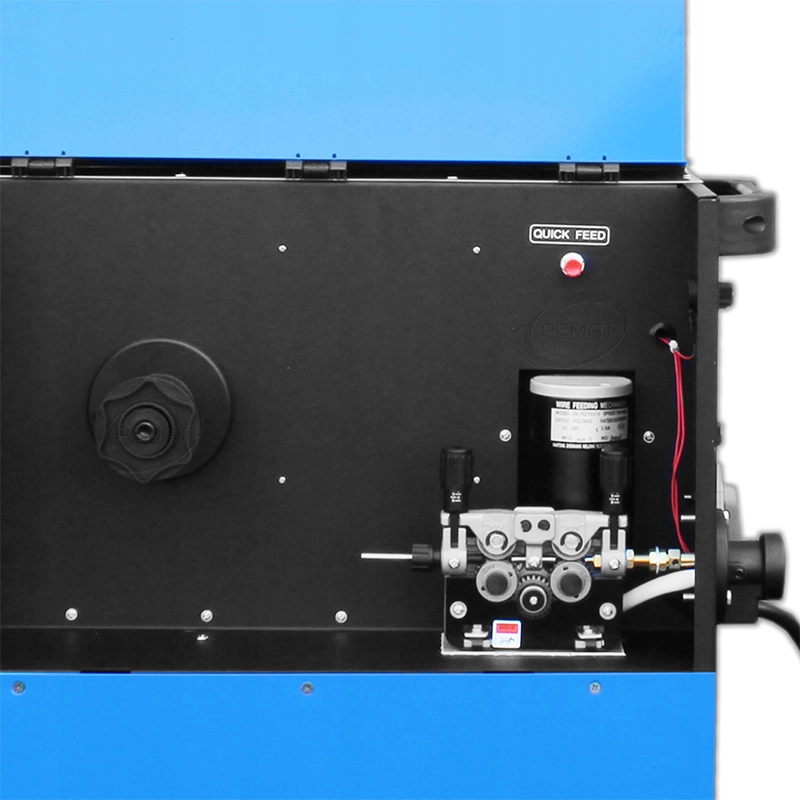 Migomat pozwala na spawanie drutami zakresu od 0,8 do 1,6 mm, co pozwala na pracę nad bardzo zróżnicowanymi grubościami materiałów. Podajnik drutu 4 rolkowy, odlewany z aluminium i napędzany kołami zębatymi doskonale poradzi sobie przy uchwytach długości 4 i 5 m.