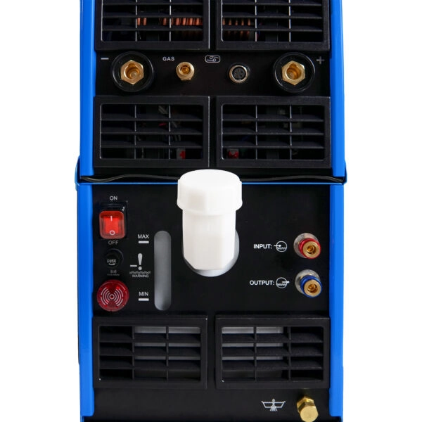 W zestawie znajduje się chłodzony cieczą uchwyt TIG T-18 o obciążalności 320 A, co umożliwia prowadzenie pracy w cyklu 60% przy wysokich prądach i bez ryzyka przegrzania. Dedykowana chłodnica oparta na miedzianej wężownicy i pompie ze stali nierdzewnej zwiększa wydajność chłodzenia oraz wydłuża żywotność podzespołów. Zintegrowany wózek oraz rozmieszczenie złączy (prąd, sterowanie, gaz, chłodzenie) ułatwiają mobilną pracę w warsztacie.