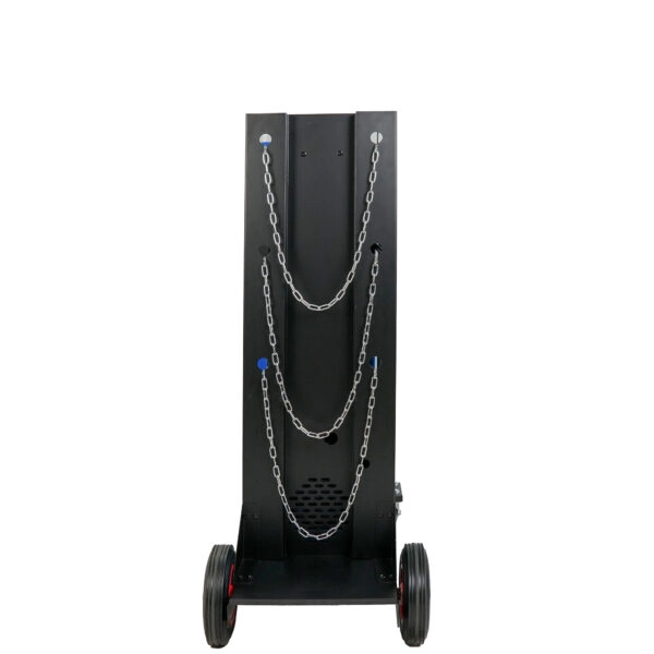 PODWOZIE JEZDNE - zazwyczaj montowane w tych większych urządzeniach, choć znajdziemy również w tych spawarkach z przedziału mocy do 200 A. Podwozie wyposażone w miejsce na butle wraz z łańcuchem do jej stabilnego mocowania.