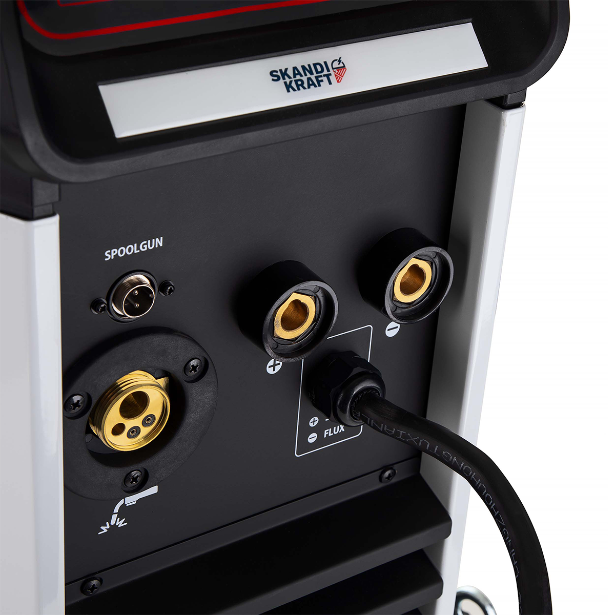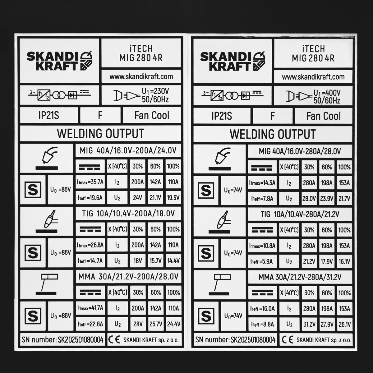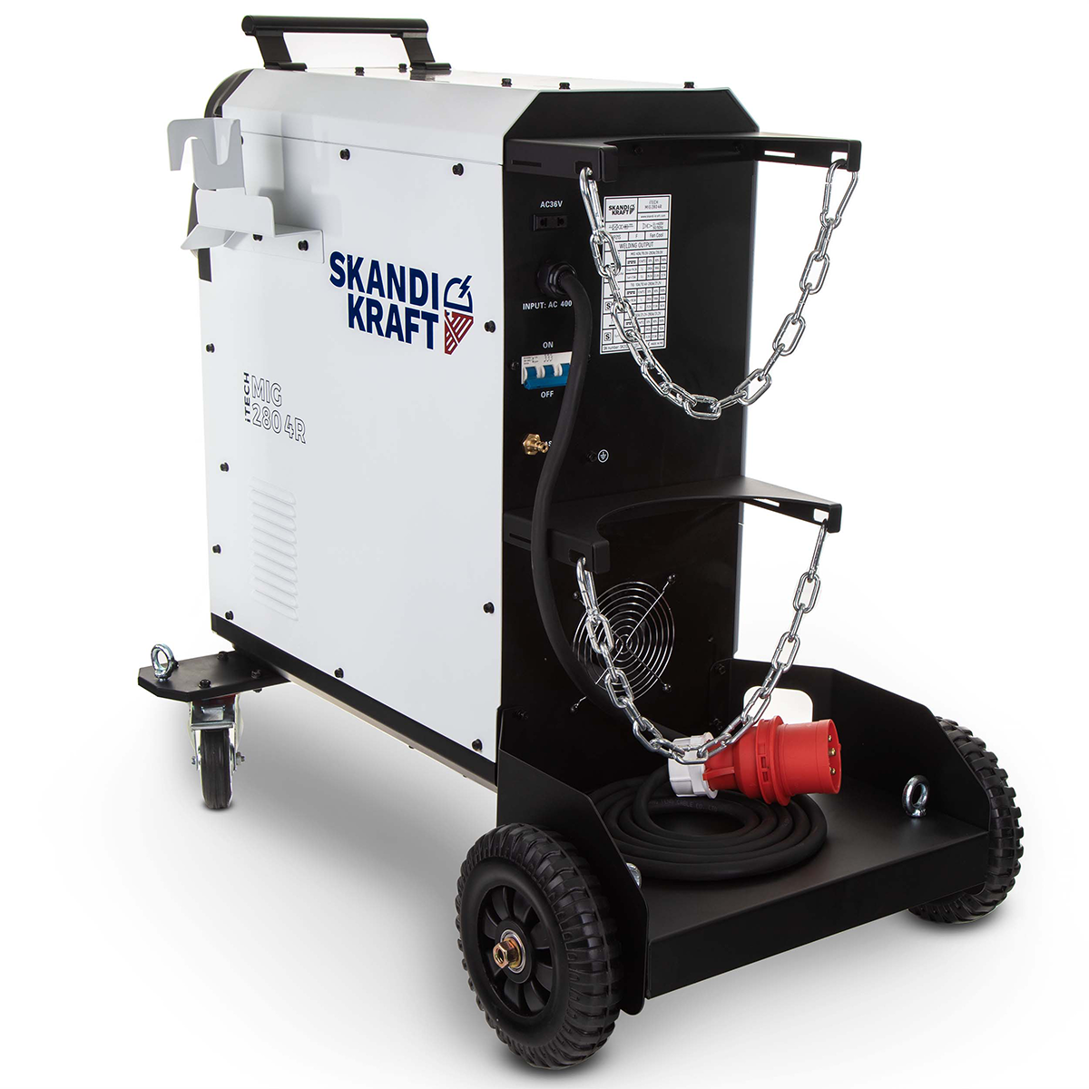 - Spawarka SKANDI KRAFT iTECH MIG 280 4R z zintegrowanym kablem zasilającym o długości 3 metrów i przekroju 4x4 [mm2]
