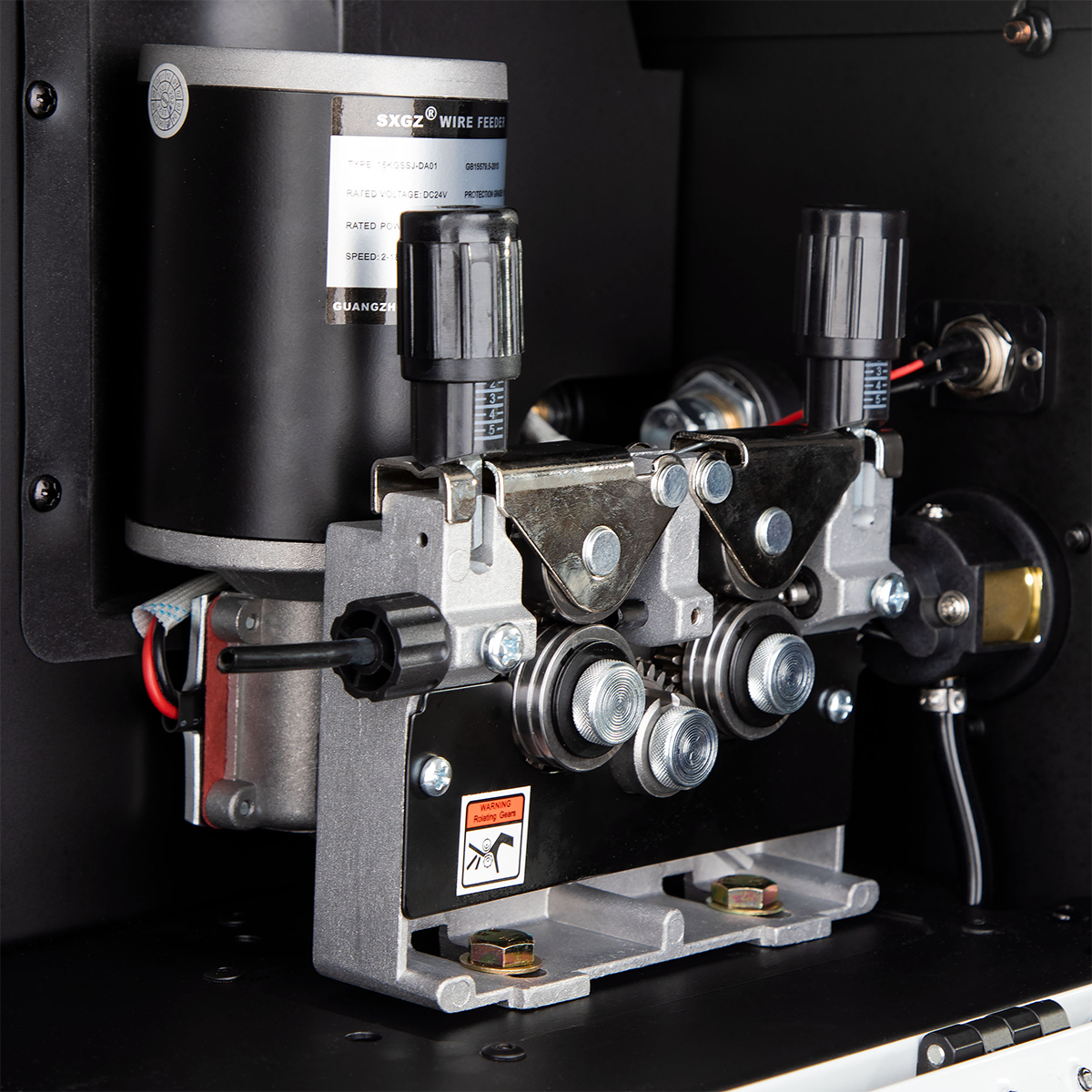 Spawarka z 4 rolkowym podajnikiem drutu, dzięki któremu drut podawany jest płynnie i jednostajnie w zależności od potrzeb. Zaletą rozbudowanego podajnika jest możliwość podłączania długich uchwytów MIG. Lampka wewnątrz spawarki umożliwiająca łatwą wymianę drutu w podajniku. Przycisk umożliwiający szybkie wysunięcie drutu (inching).