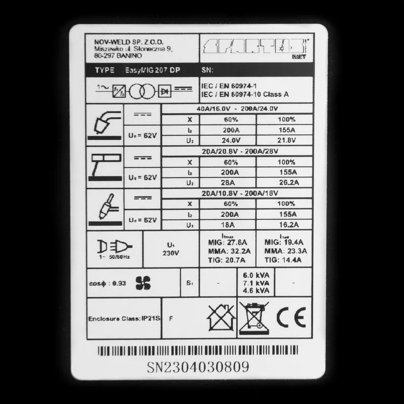 Spawarka SPARTUS Easy MIG 207 DP to nowoczesny, inwertorowy półautomat spawalniczy skonstruowany w oparciu o tranzystory IGBT. Umożliwia synergiczne spawanie MIG/MAG z podwójną pulsacją, synergiczne spawanie MIG/MAG z pojedynczą pulsacją, spawanie MIG/MAG w trybie synergicznym, spawanie MIG/MAG w trybie ustawień ręcznych, spawanie TIG Lift, spawanie elektrodą otuloną MMA. Maksymalny prąd spawania dla metod MIG/MAG/TIG/MMA wynosi 200A. Urządzenie zasilane jest z sieci jednofazowej 230V.