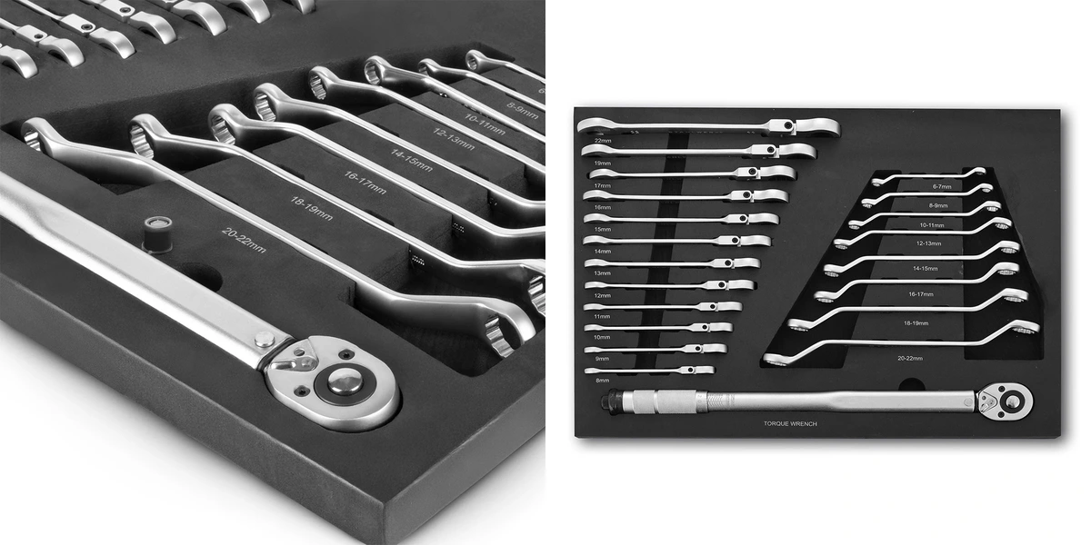Wkładka narzędziowa o wymiarach 520 x 395 mm pasuje do większości standardowych wózków warsztatowych dostępnych na rynku. Wykonana z trwałej i odpornej na oleje pianki, chroni narzędzia przed przemieszczaniem się i uszkodzeniami mechanicznymi. Każdy klucz ma swoje precyzyjnie wycięte miejsce, co pozwala na błyskawiczną weryfikację ewentualnych braków po skończonej pracy. Stal chromowo-wanadowa (Cr-V) klasy A+ gwarantuje, że narzędzia nie odkształcają się nawet pod wpływem bardzo dużej siły.